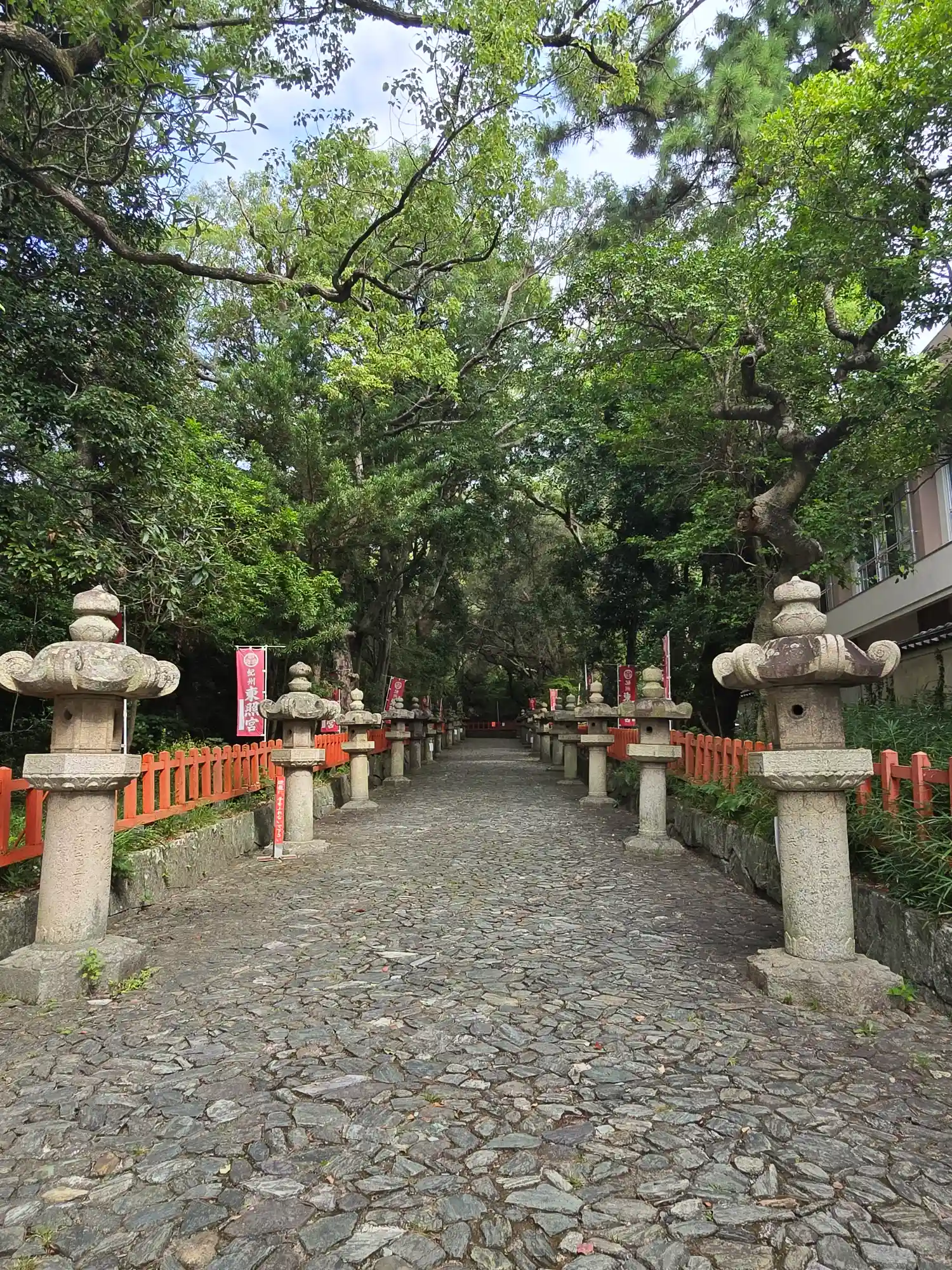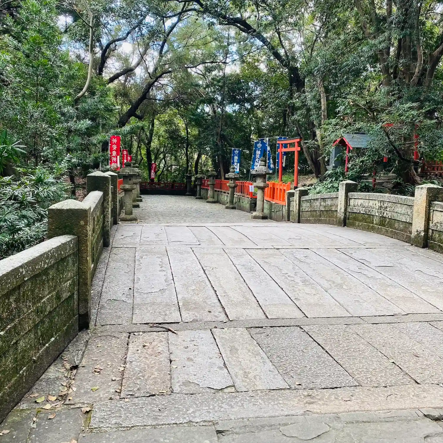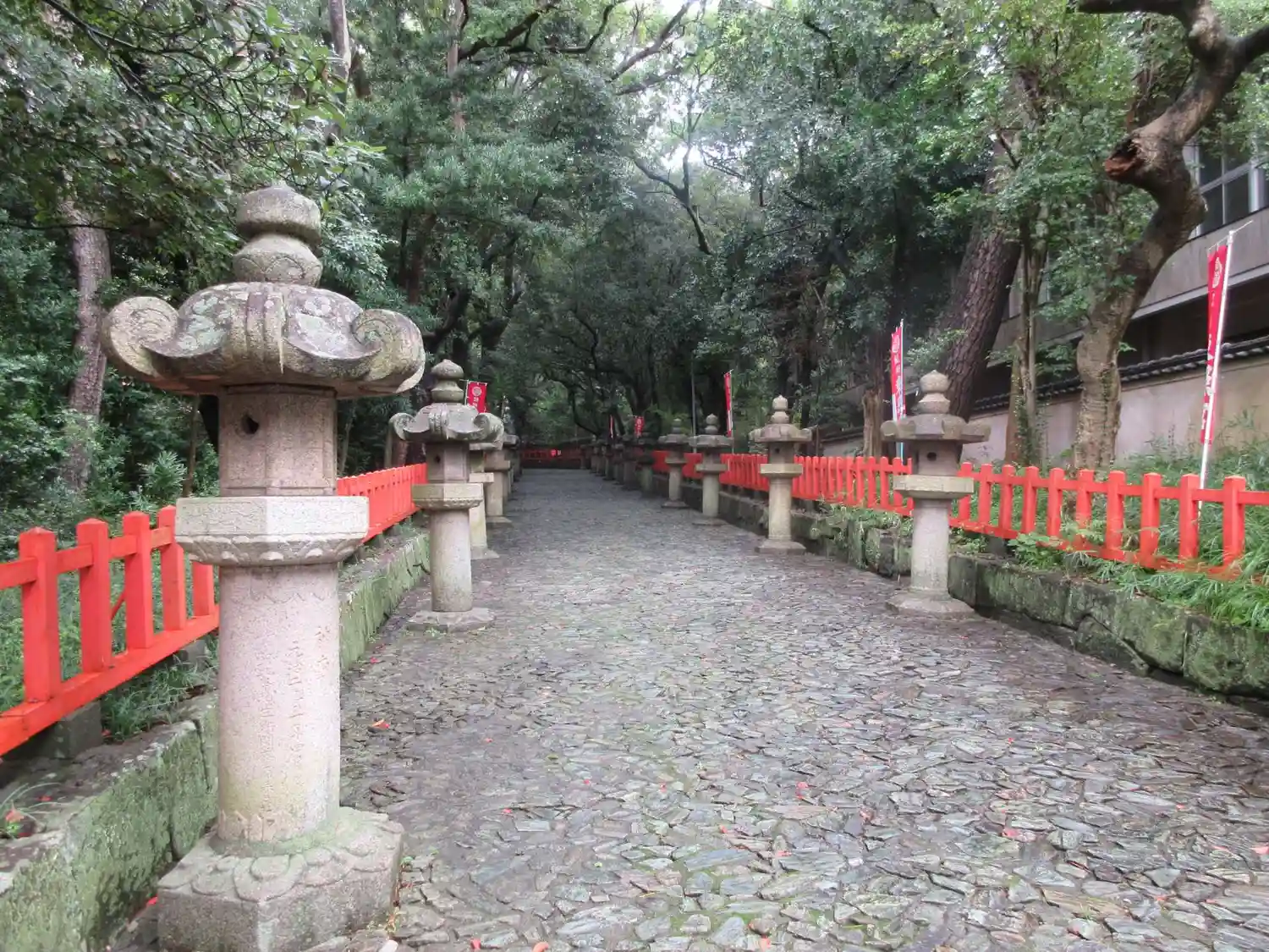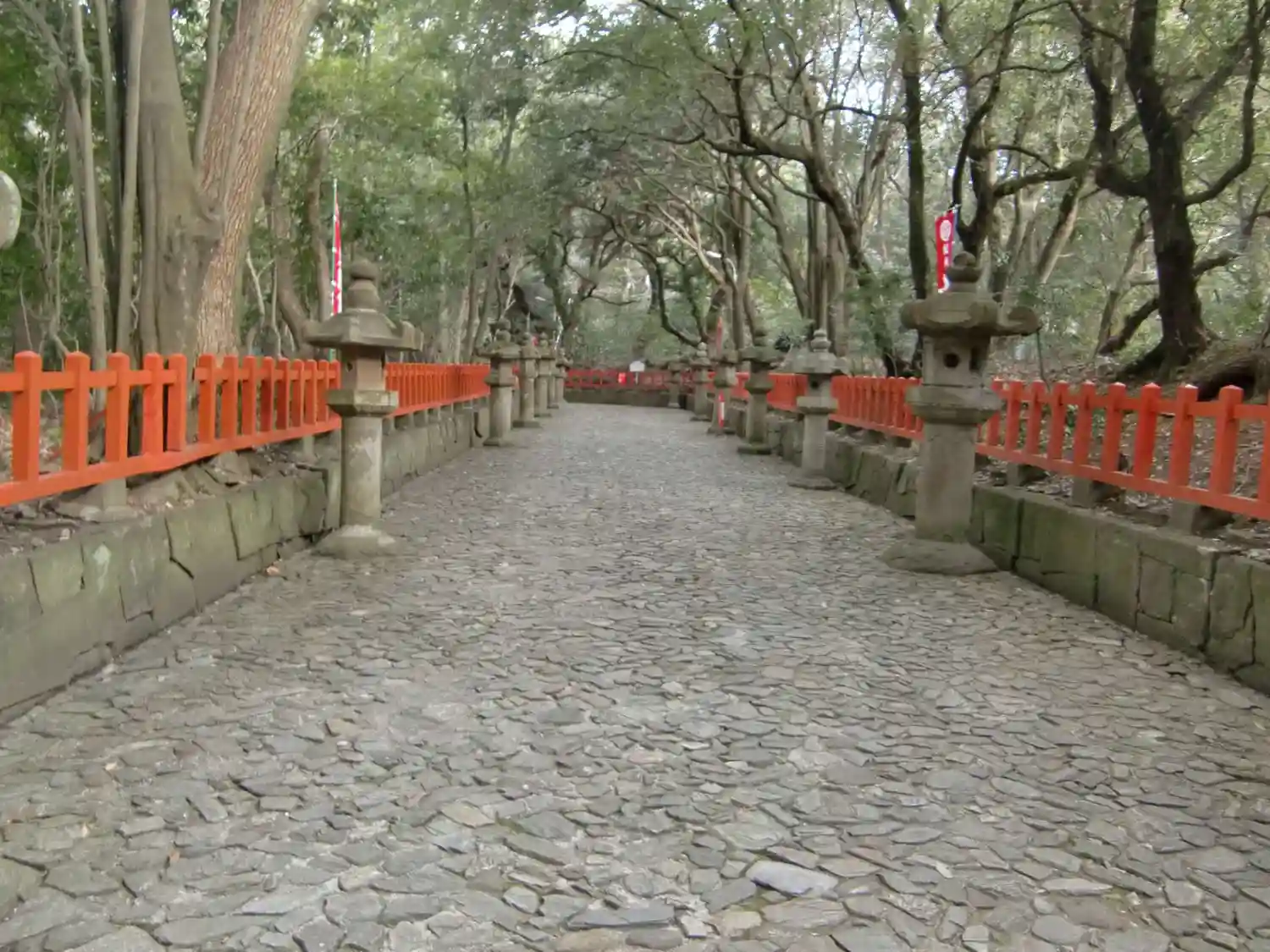 参道は石畳、両脇に石灯籠と大きな樹がたくさんで気持ち良い