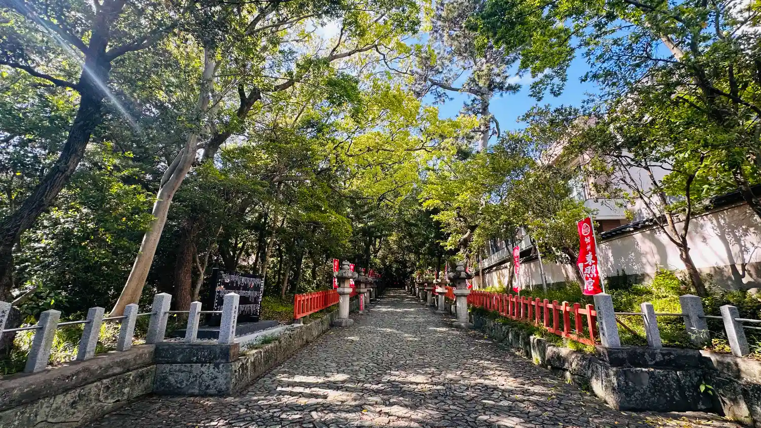 石畳の通り道を抜け、急な石段を上がったところにあります。