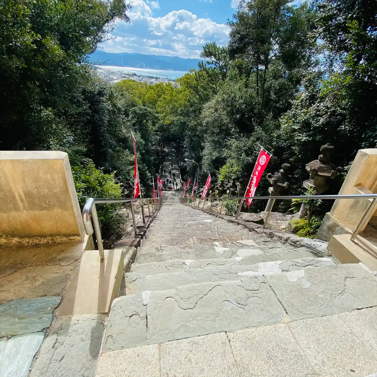 左側に写っている巫女さんはこの石段を上から駆け降りてきました!すごい😲