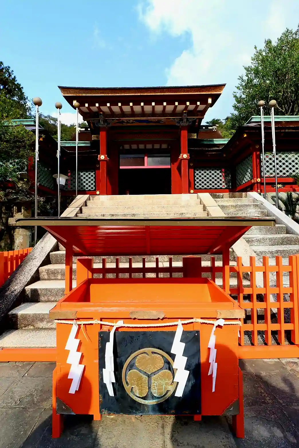 楼門は大きくて色形も美しく、欄干は雲や鳳凰、家紋が繊細に施されています