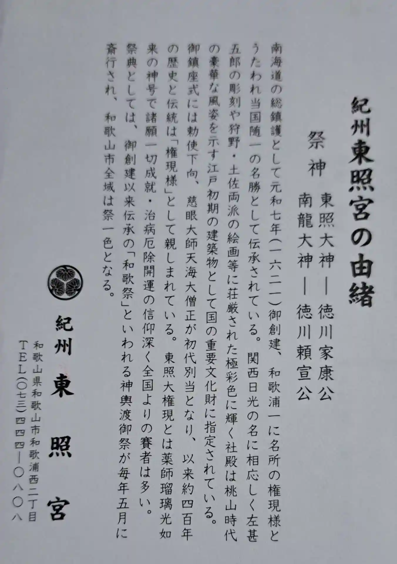紀州初代藩主であり、徳川家康の第10子・徳川頼宣が父家康を祀るために元和7年(1621)に創建した…