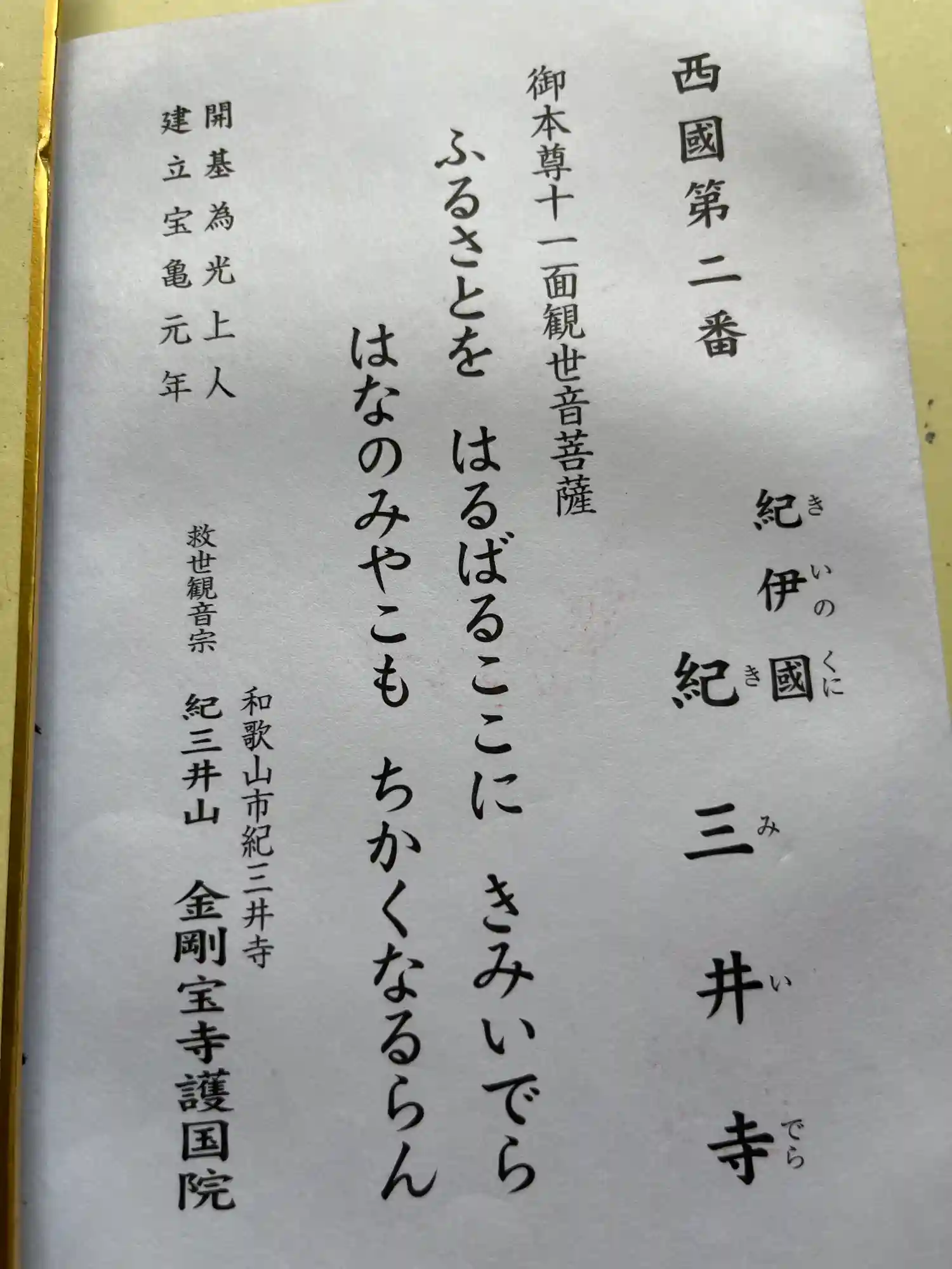 御詠歌【ふるさとを はるばるここに 紀三井寺 花の都も 近くなるらん…