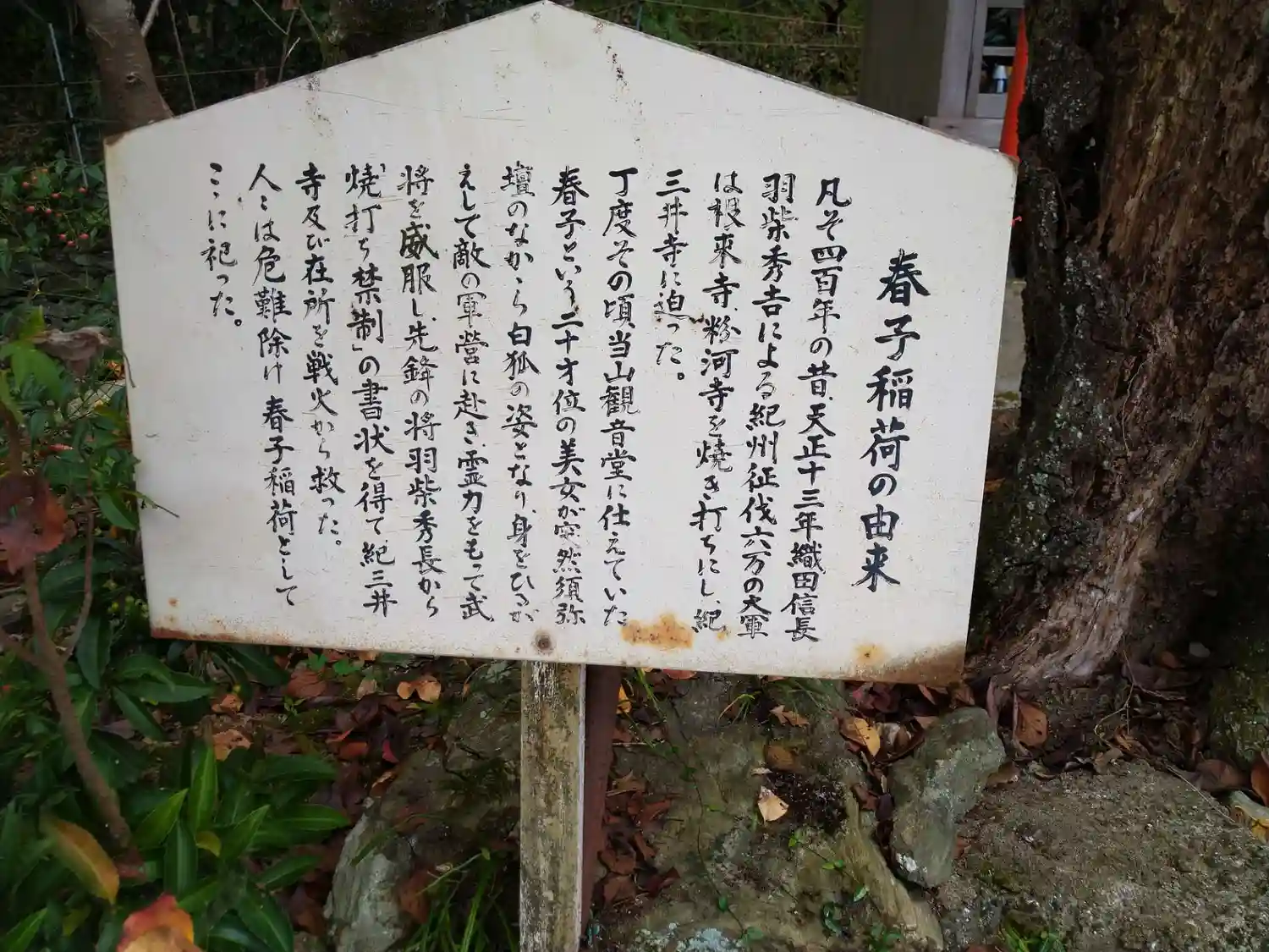 春子稲荷 天正13年信長・秀吉による奇襲征伐の際、根来寺粉河寺焼き討ちされ紀三井寺まで迫ってきました。この寺の観音堂に仕えていた春子と言う20歳の女性が白狐の姿に変化し霊力をもって秀吉より「焼き討ち禁制」の書状を受け取り戦火を免れたという伝承が残っている。それ以降、厄難よけとして春子稲荷は信仰されている。