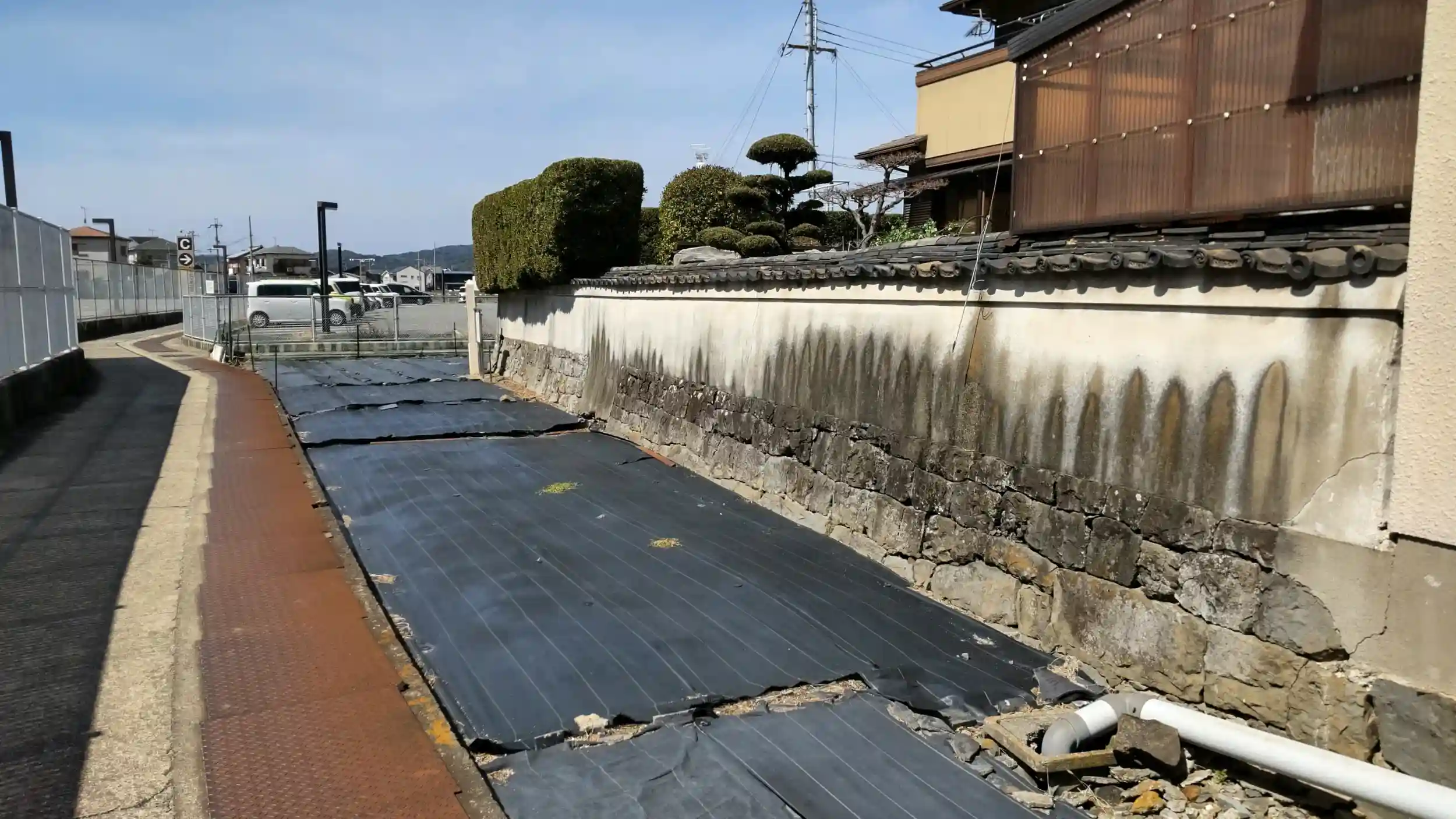 ①民家の塀の下に当時の石垣が使用され残っている