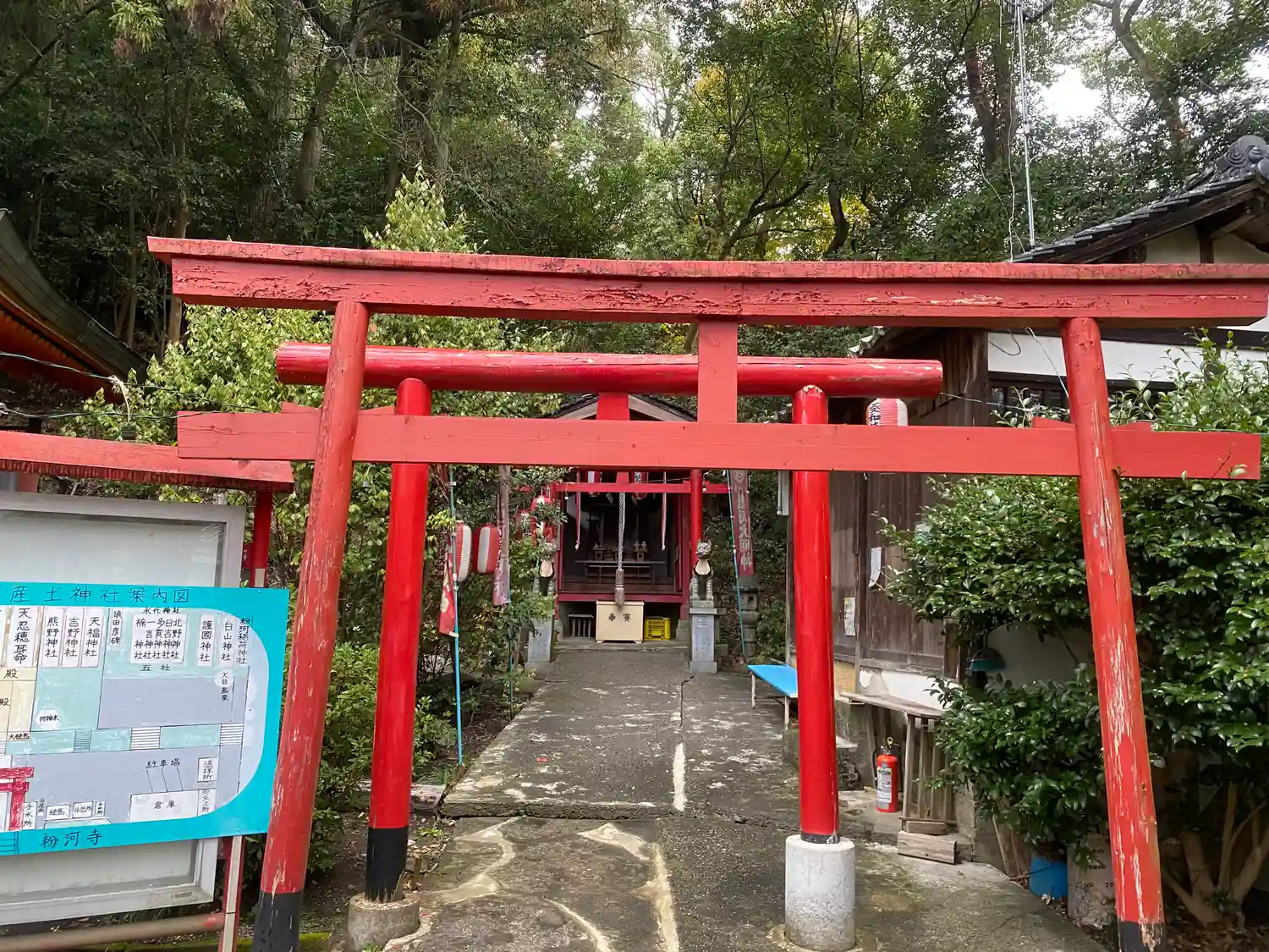 粉河産𡈽神社は、「寺は石山、粉河、志賀(枕草子)」とうたわれた西国第三番 粉河寺の境内に鎮座し、主祭神に天之忍穂耳命、丹生津比命の二柱をまつり、別名「たのもしの宮」と呼ばれています。