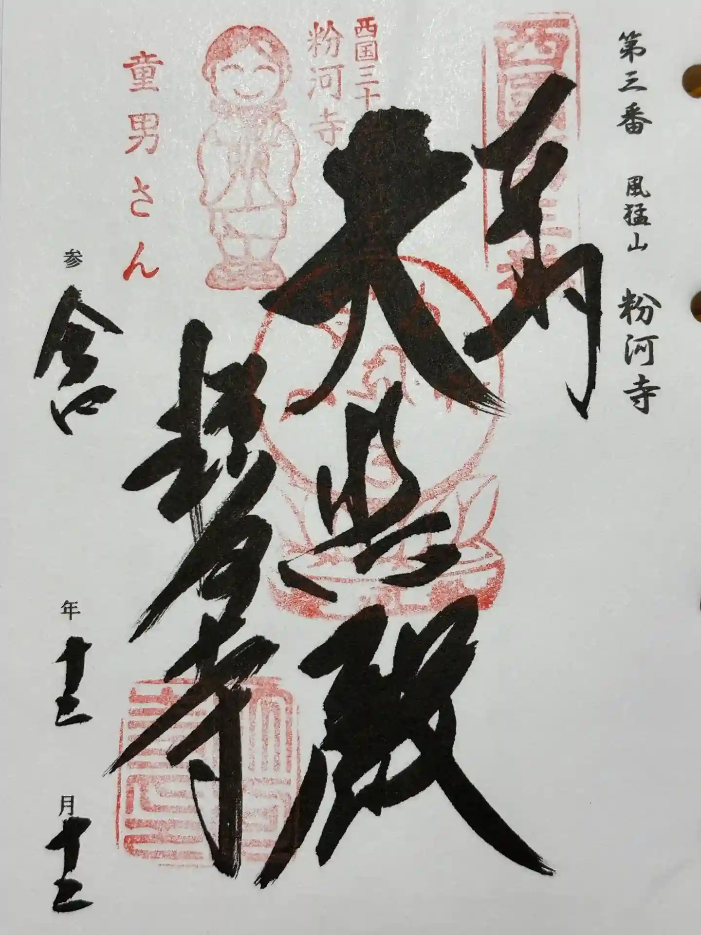 真ん中に大悲殿、左下に粉河寺と書かれ、右上に西国第三番の印、真ん中に梵字の印、左上に童男さんの印、左下に粉河寺の印が押されています。