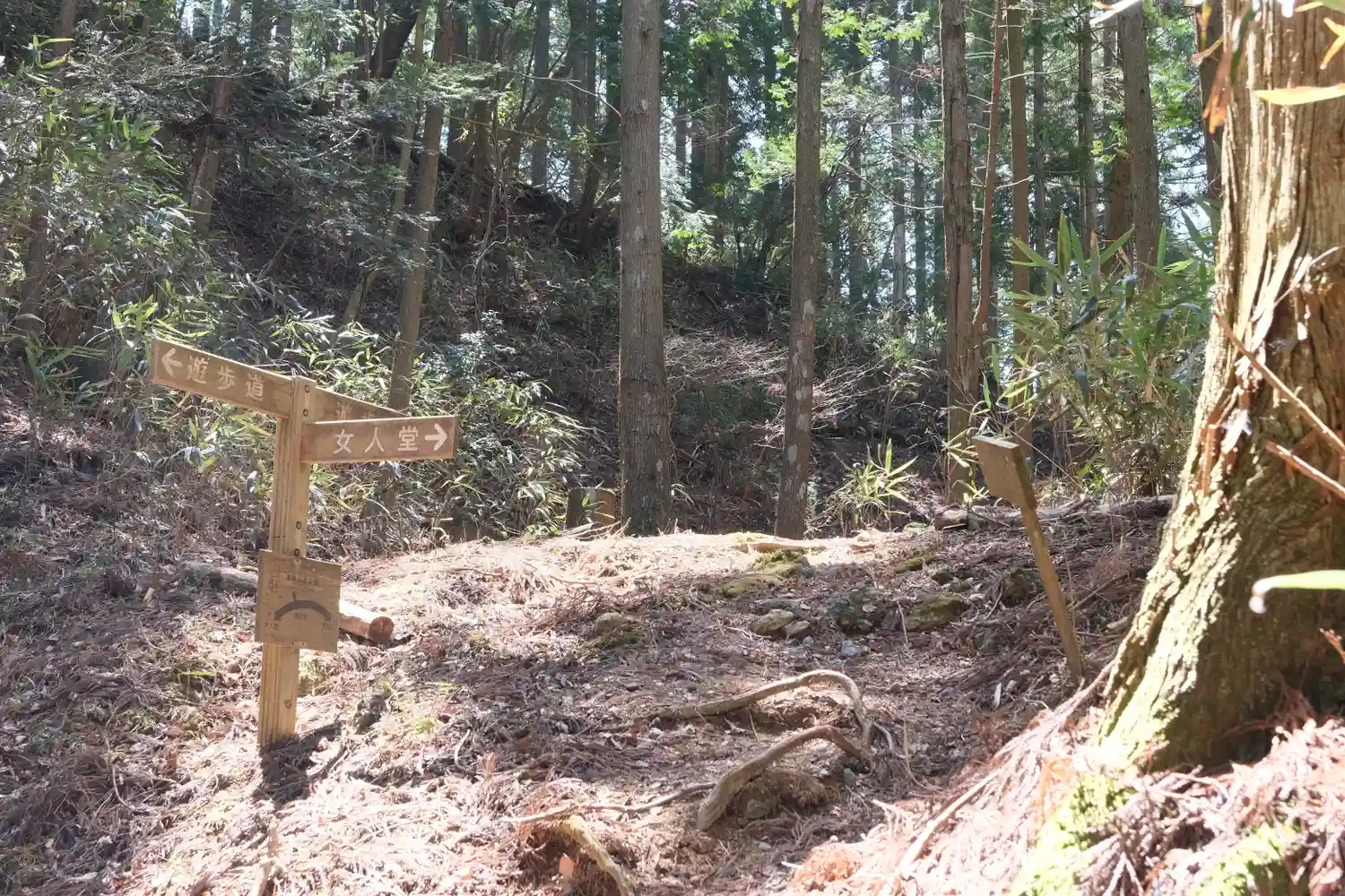 向かいのバス停の背後にある坂道が女人道。