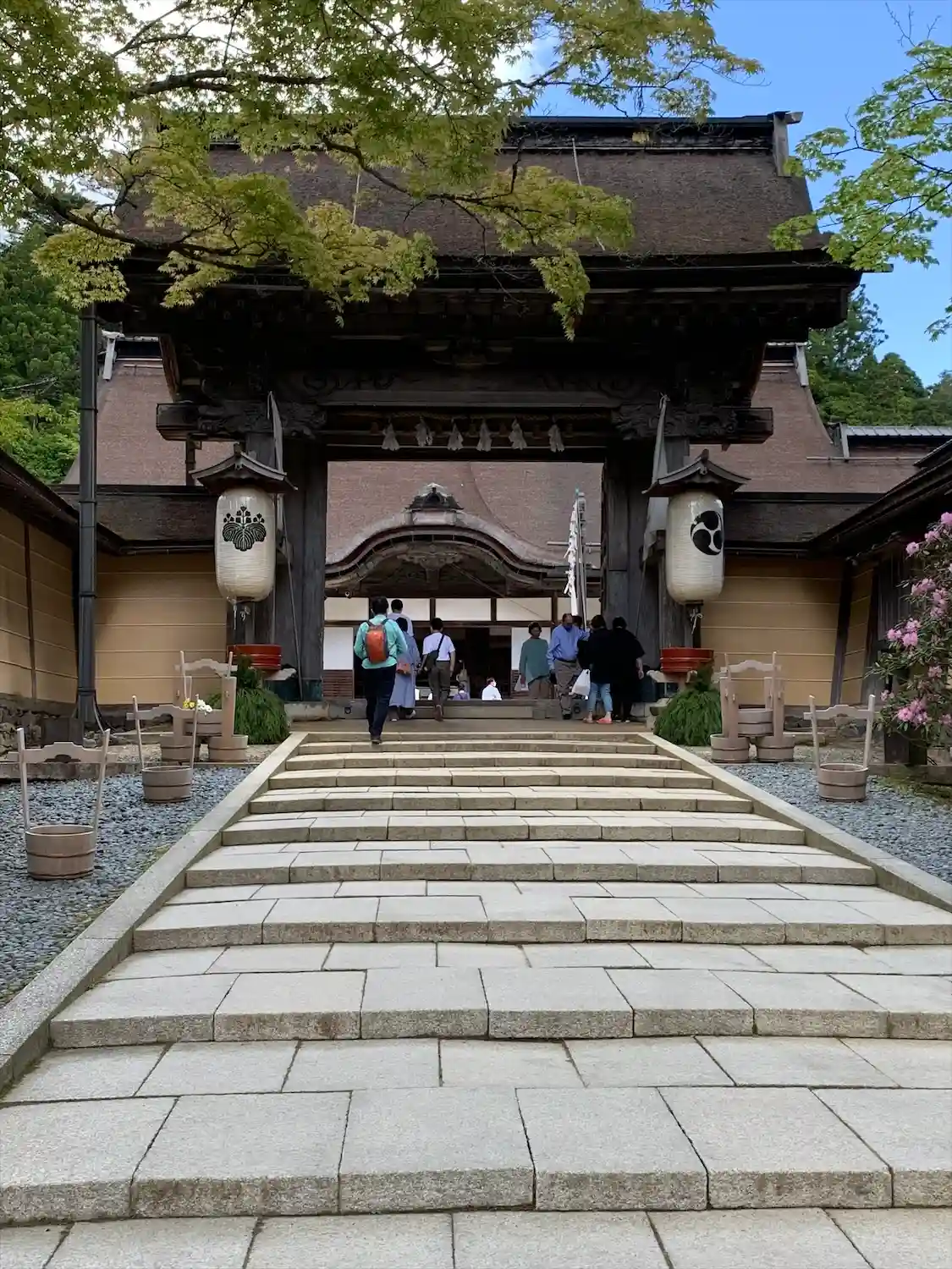 高野山にはお寺が沢山ありますが、最も大きなお寺でした。 正門に続く階段の両脇に桶が均等に置かれています。