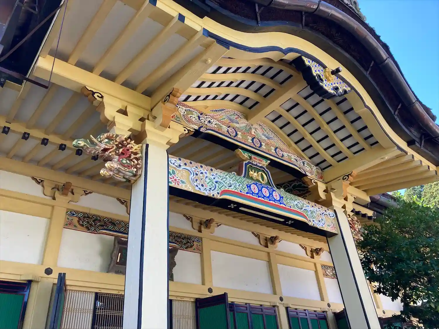 象のカラフルな彫り物が印象的。寺社内にカフェあります。