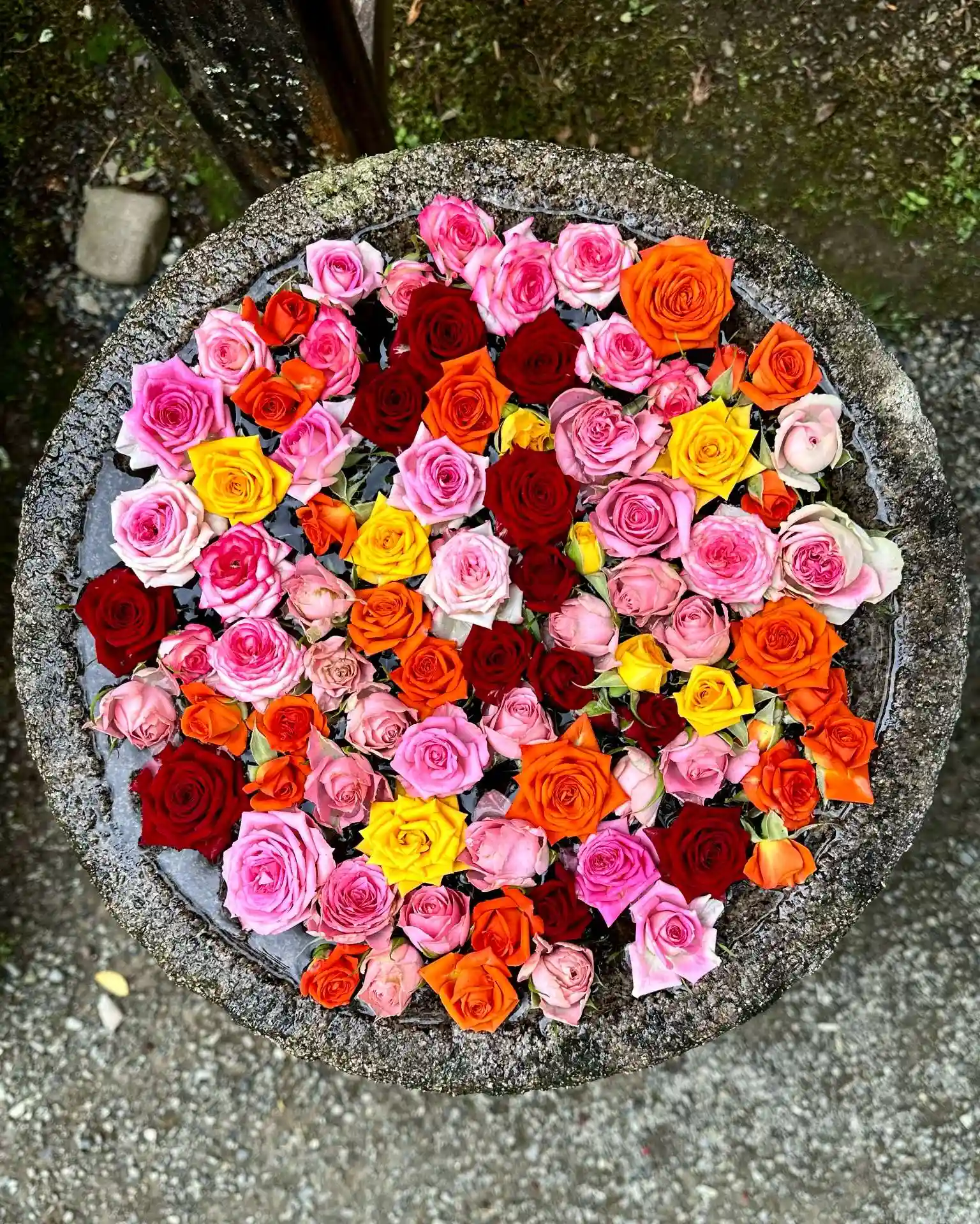 比売神社ゆかりのバラの花が飾られた花手水です。神様だけではなく、お参りの方々の目も楽しませています。