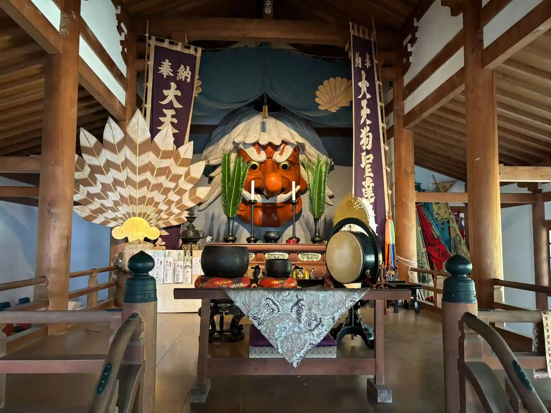 戦災に遭った七堂伽藍を天狗が一夜にして建立したという伝説にちなみ、高さ2.4m、幅2.7mの大天狗の面が奉られているとのことです。