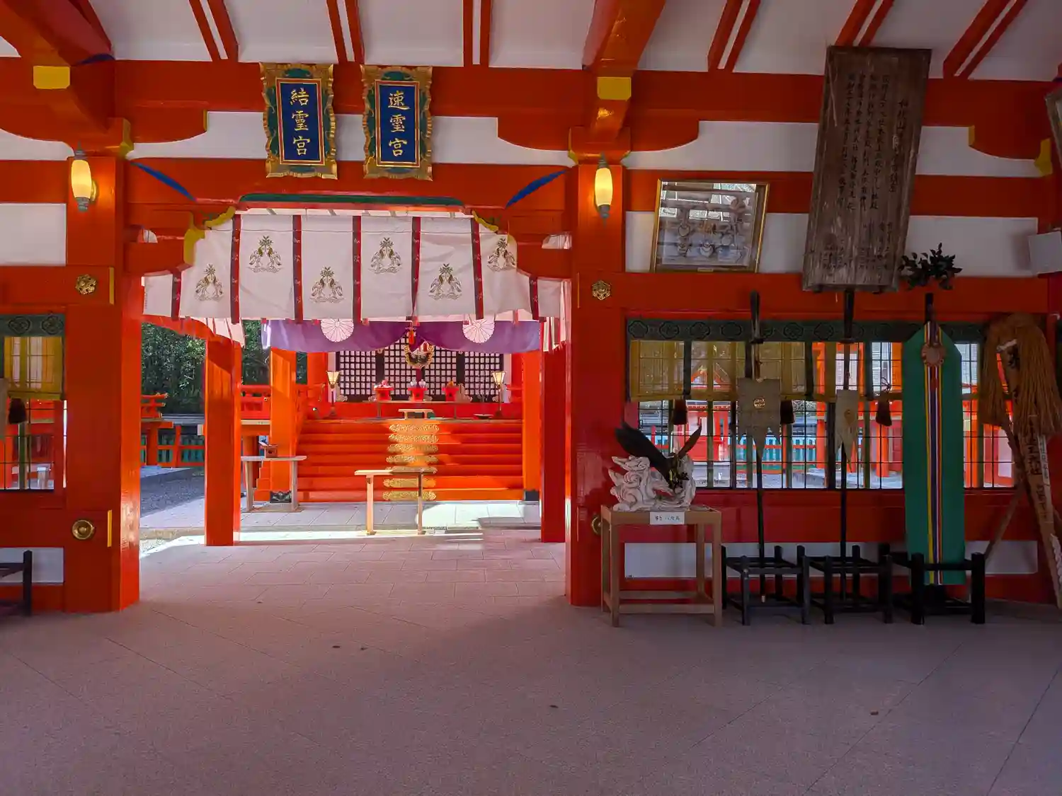 また、日本最初の国宝に指定された御神像をはじめ、南北朝時代に天皇、幕府、諸国大名から寄進された凡そ千点を数える国宝古神宝類が伝わり、その一部を熊野神宝館で展示しています。