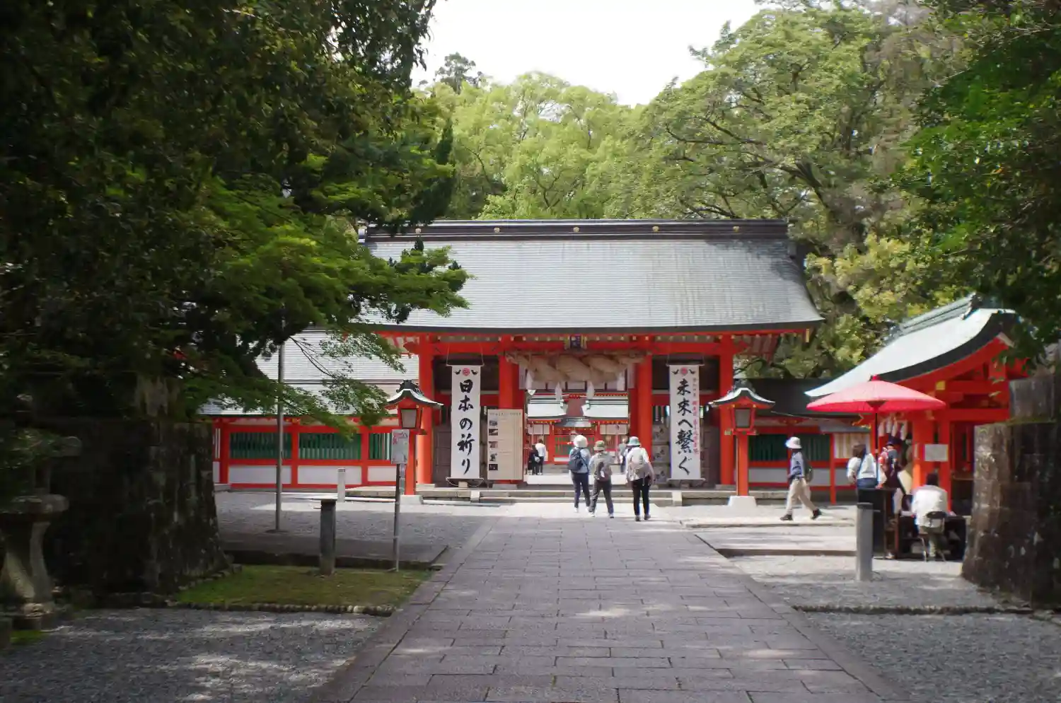 熊野古道は難行苦行の厳しい道のりであり、やっと辿りついた人々を老若男女問わず、強者弱者を問わず、分け隔て無く受け入れてきた熊野速玉大社の歴史が、「濡れわら沓の入堂」(雨風に打たれながら古道を遙々歩いてきた人々を濡れたわらじの姿のまま拝殿にお通しするという意味)という社訓となって、今も大切に受け継がれています。