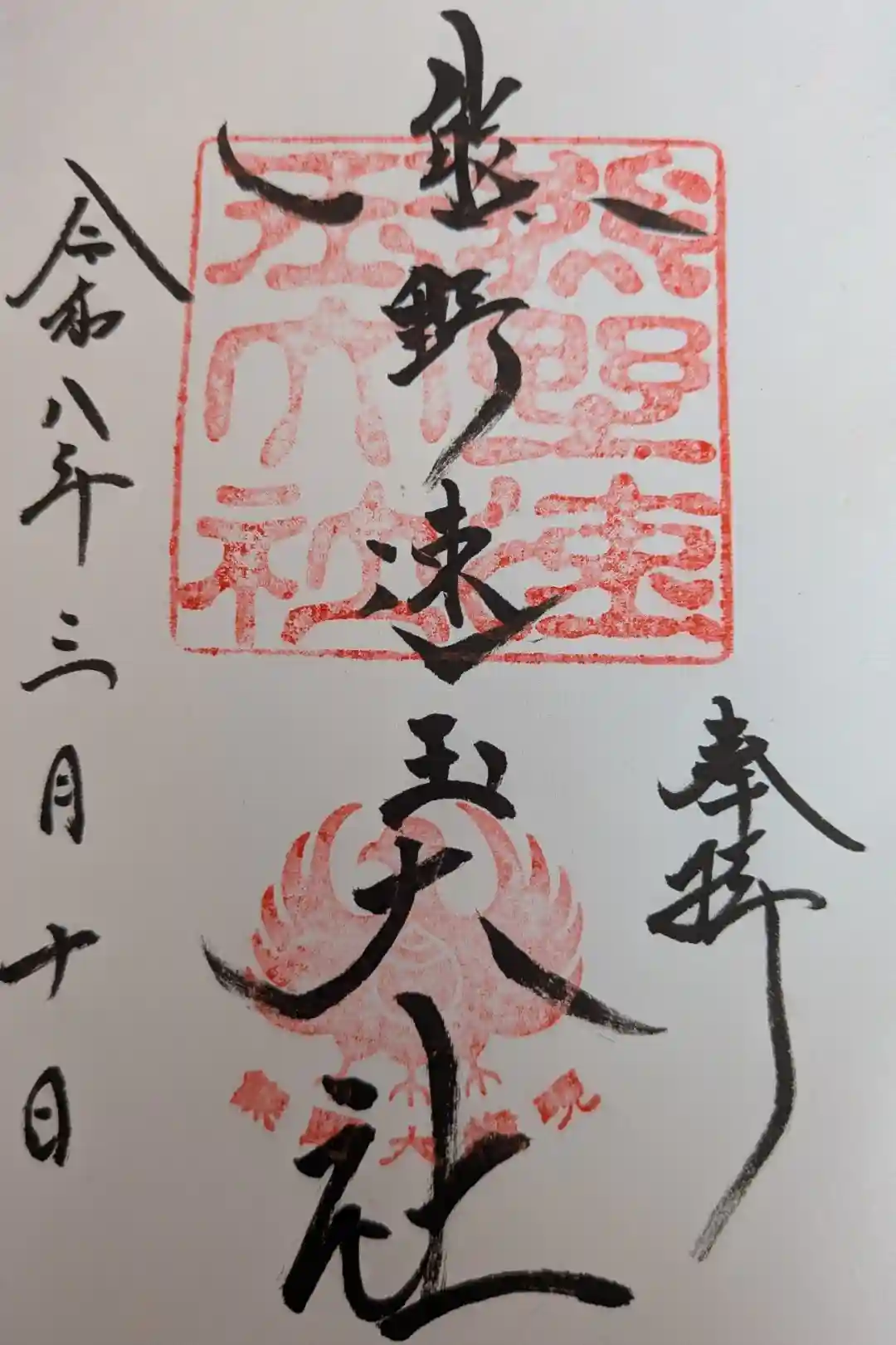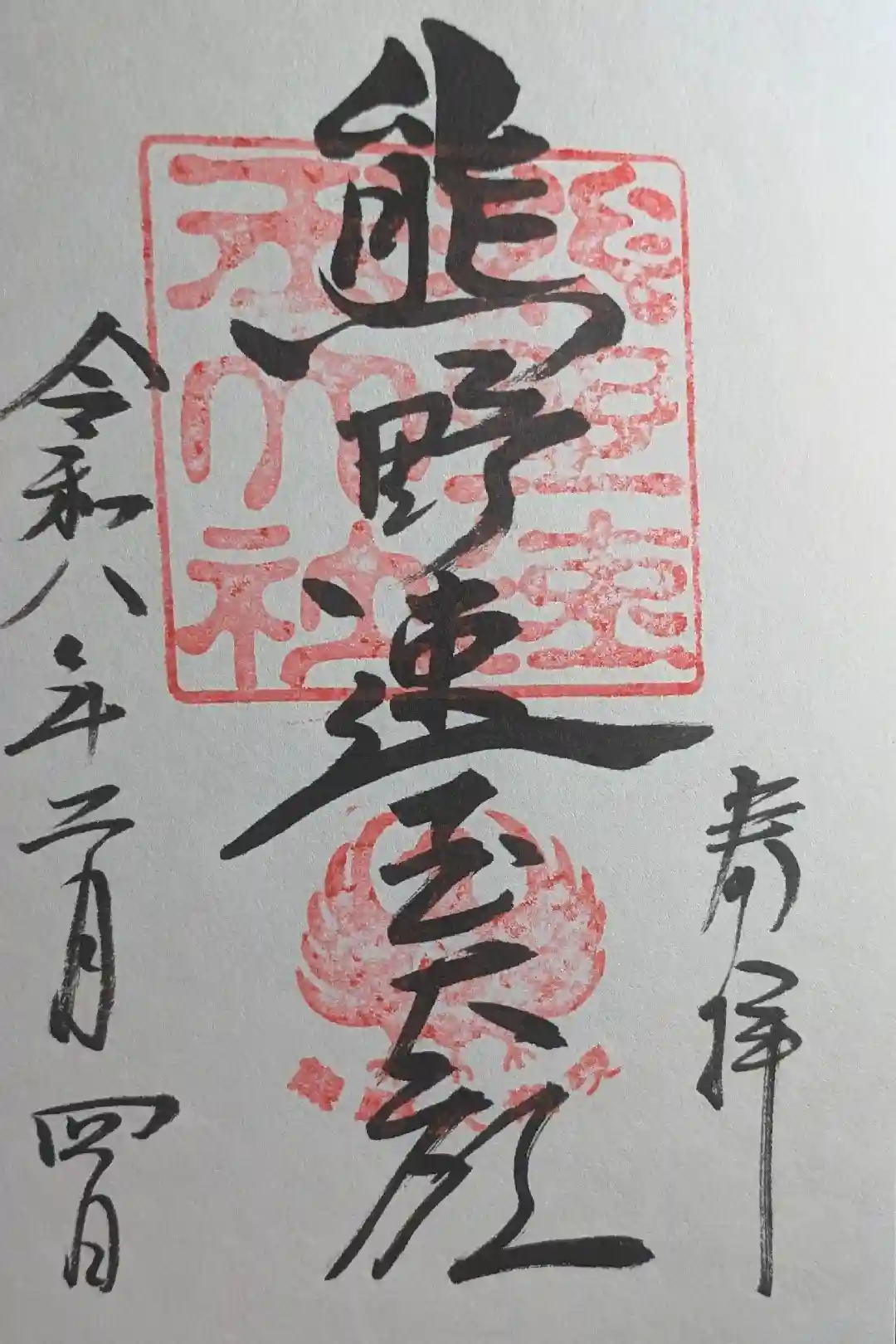 真ん中に「熊野速玉大社」印と御神使の八咫烏の印が押されて、その上に「熊野速玉大社」と墨書きされています。