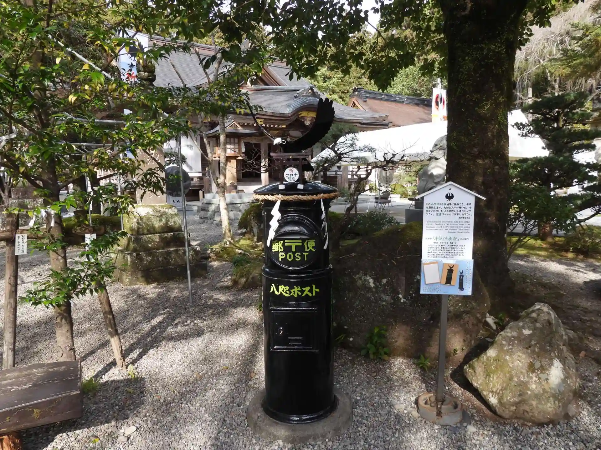 「熊野三山」の本宮です。明治時代の中期、大きな水害があり現在の場所に移築されたそうです。それまでは、近くの「大斎原」に鎮座されていたようですが、現在は大きな鳥居が残されています。「八咫烏」もあちこちで見かけることができます。
