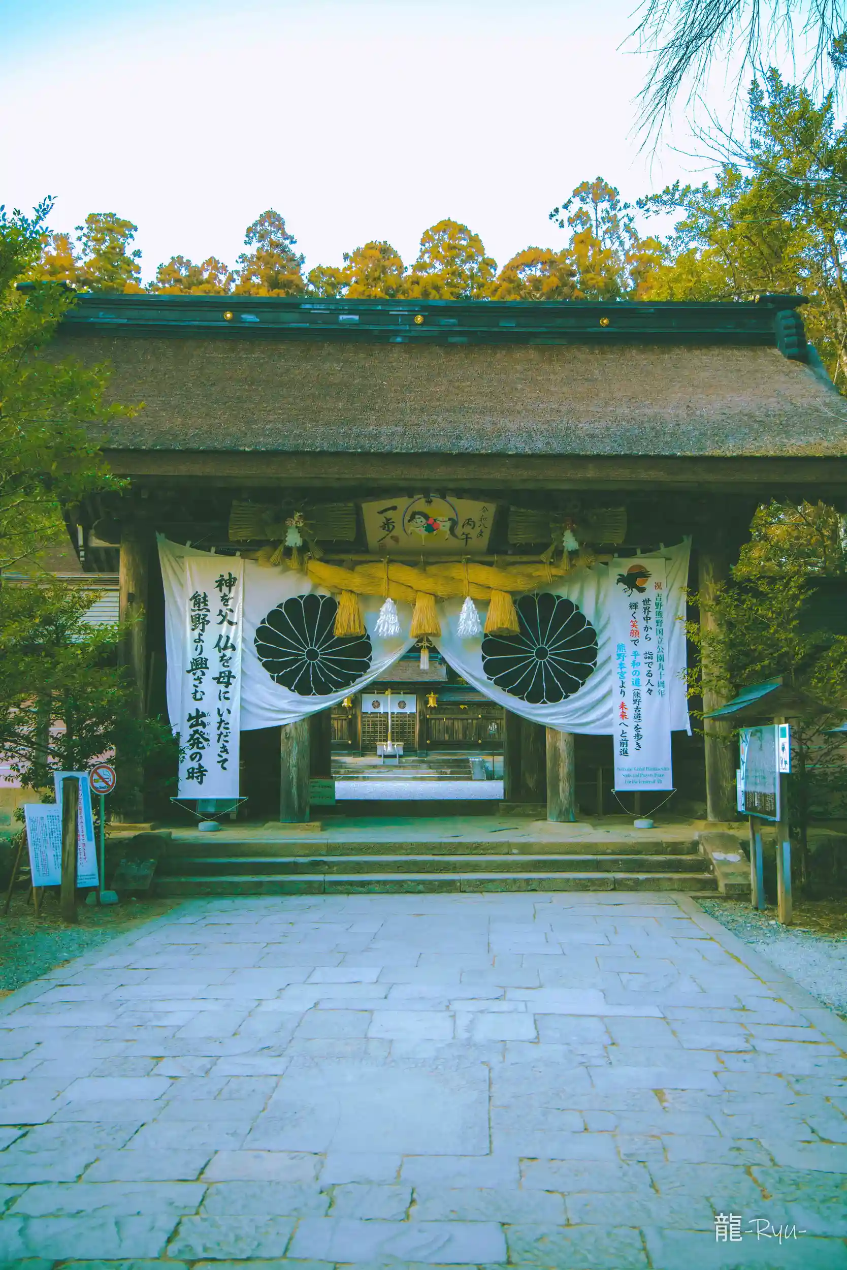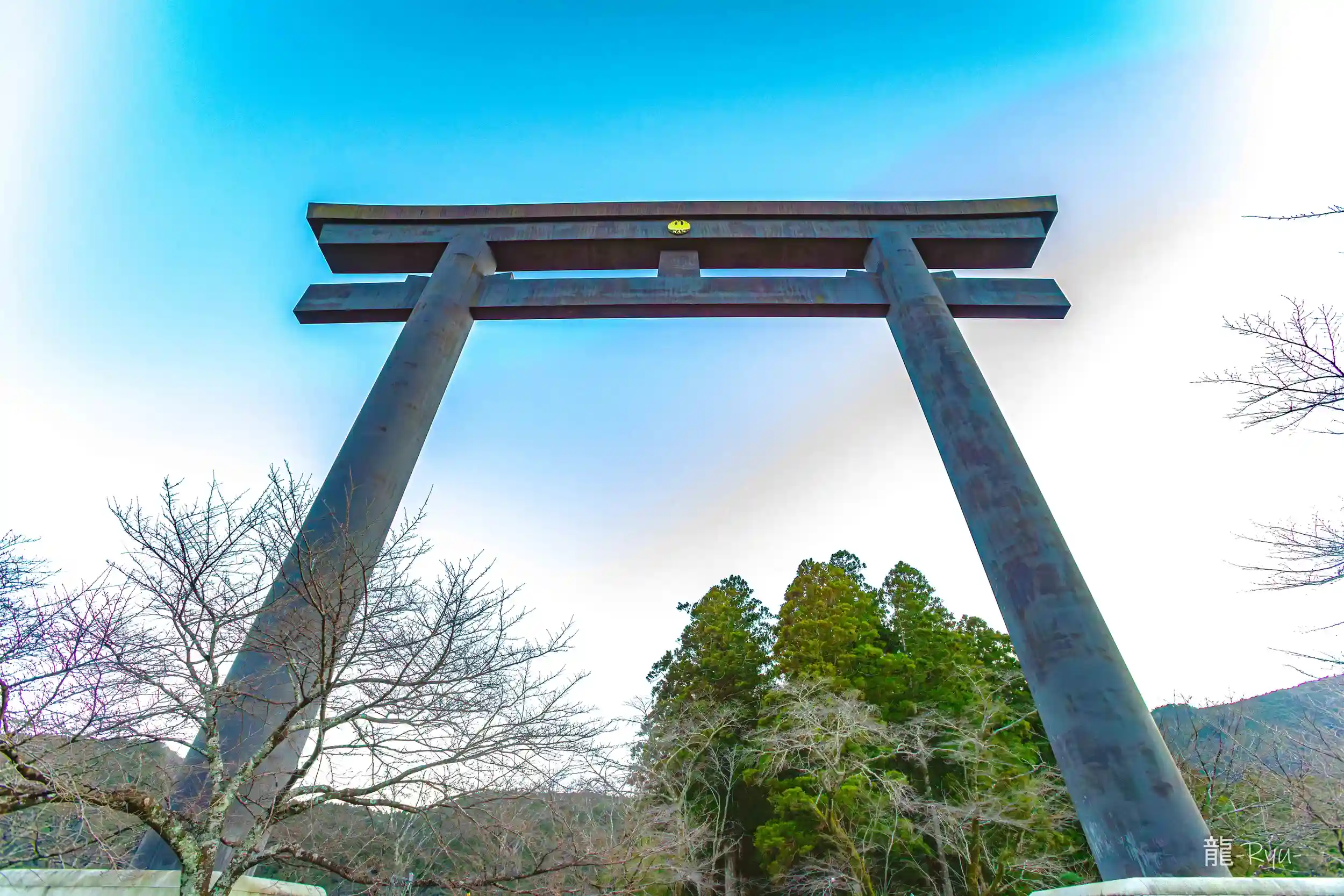 旧社地の大斎原には日本最大級の鳥居として知られる大鳥居が建ち、高さ約34メートルの日本一の鋼製鳥居が熊野川のほとりに悠然と立ち、聖地の象徴として参拝者を迎えています。