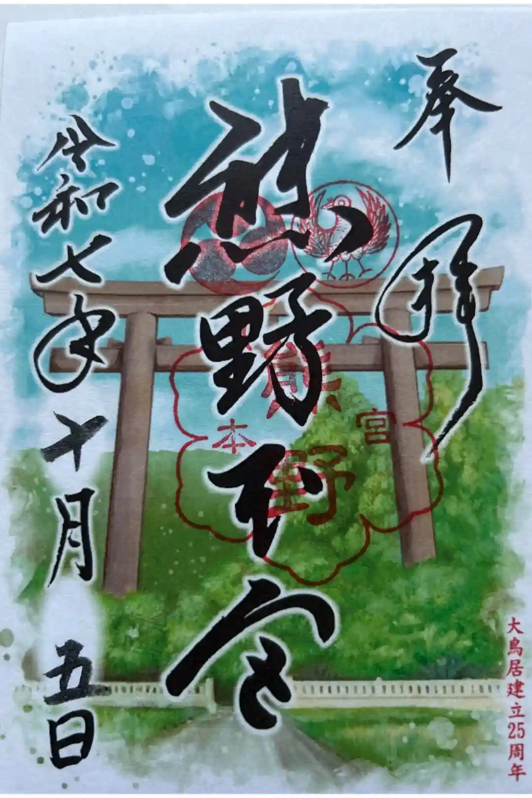 熊野本宮大社旧社地の大斎原(おおゆのはら)にある大鳥居の建立20周年を記念した特別限定御朱印です。