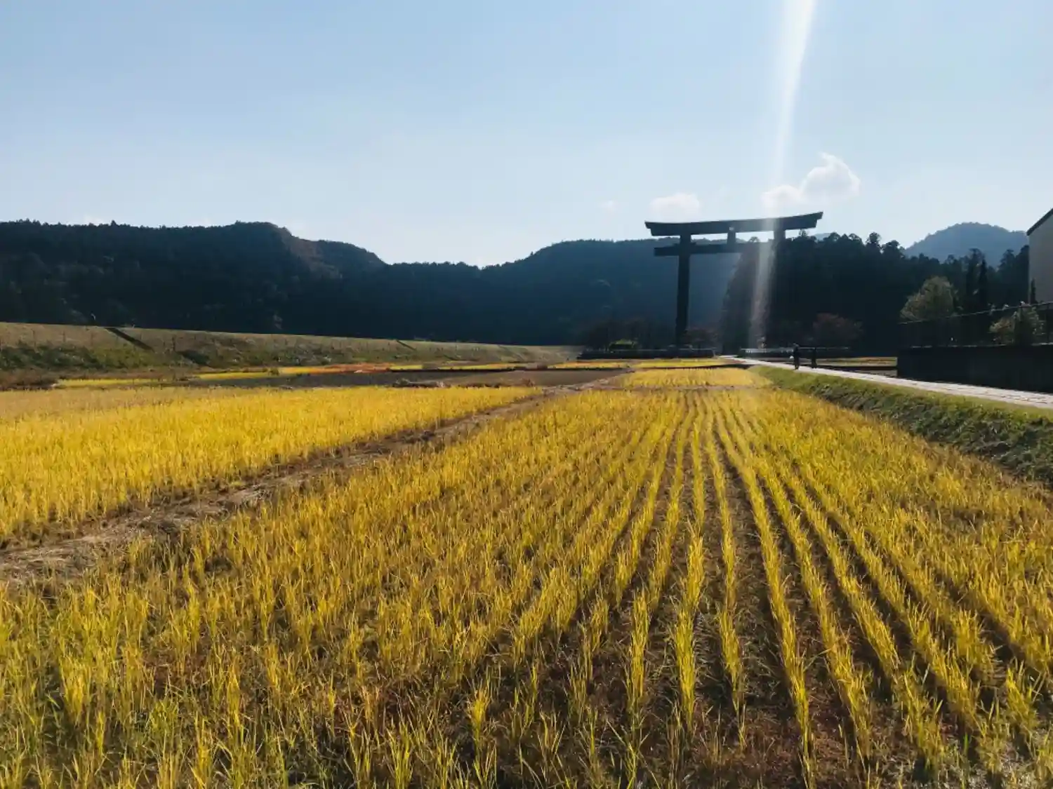 とんでもなく大きな鳥居がある。天気が良かったので横の堤防でみんなが座って…