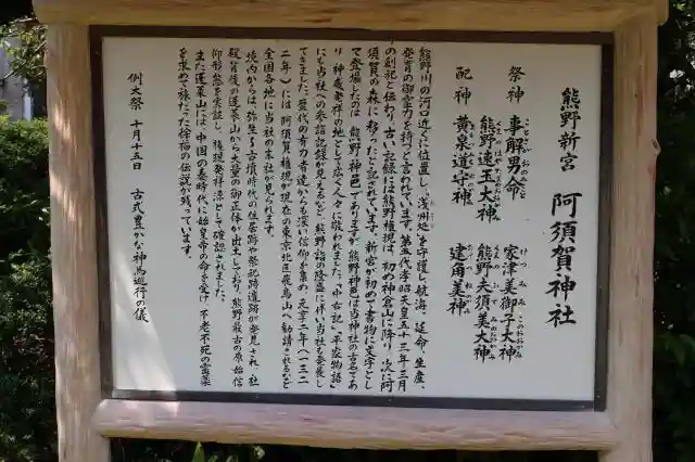 由緒より~ 阿須賀神社は、日本書紀にしるされている熊野村、熊野神邑であり遠く第五代孝昭天皇の御世の創立と申されます。御承知のとおり伊邪那美命が熊野に参られ御生みになった神々をお祀りし、従って熊野は黄泉の国常世の国と読まれ、初め宇津美御子命は貴称谷、結速玉命はアスカの森に二宇の社、第十代崇神朝には熊野川上流の音無ノ里、結速玉命は第十二代景行朝、今の新宮に遷座、当社は熊野発祥地と言われています。・・・