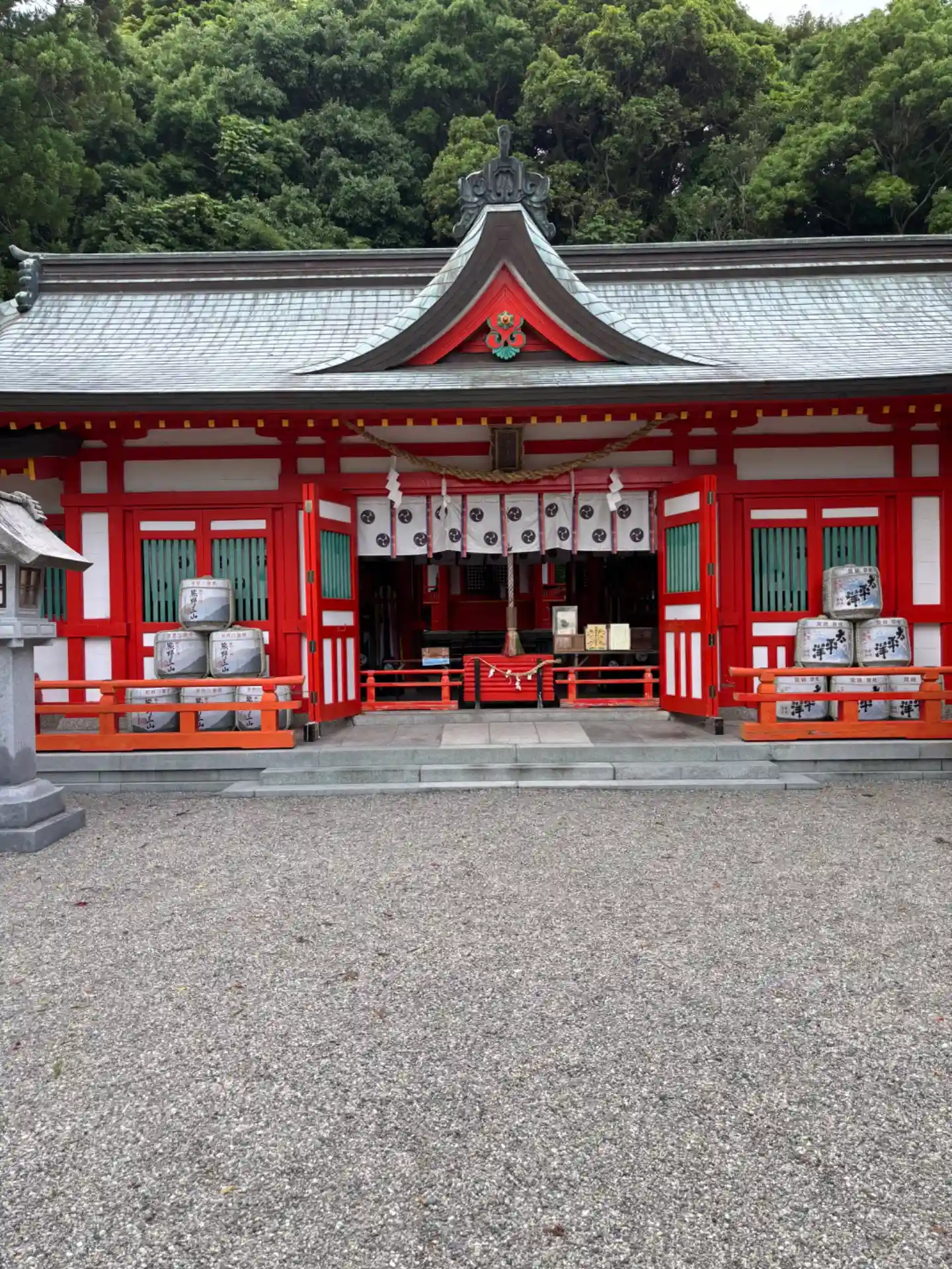 鳥居から境内を望むと、拝殿と、その向こうに蓬莱山が見えます