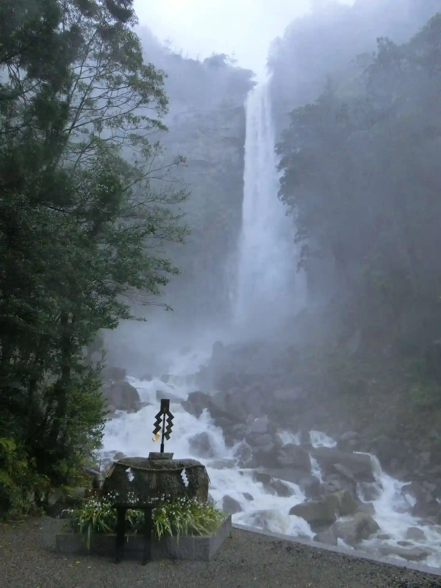 大雨の中の参拝なので那智の滝の水量がものすごいです。「ダムの放水か!」というレベルで轟音と共に水が落ちていきます。