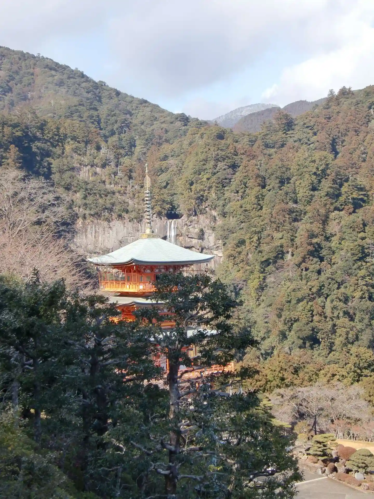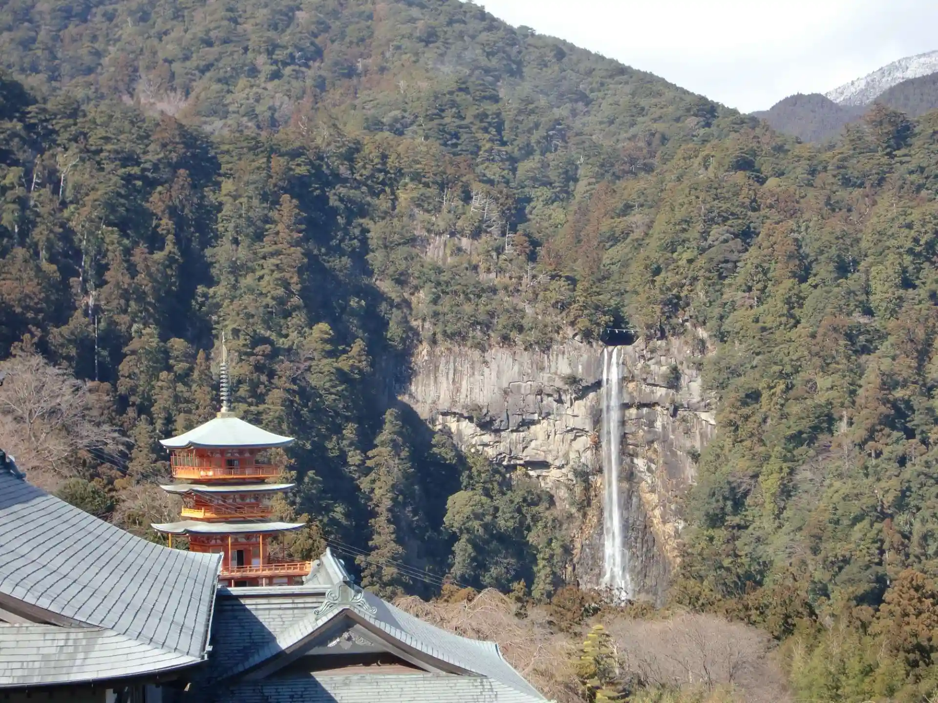 三重塔の向こうに那智の滝が見えます。