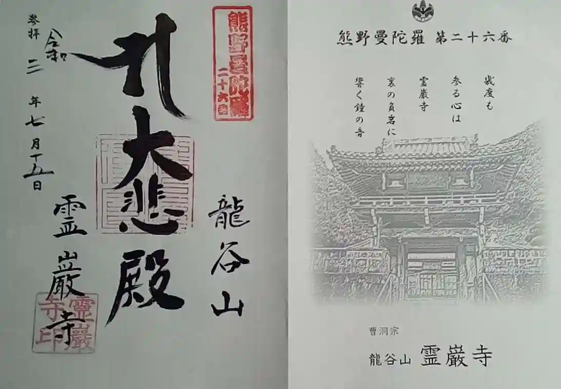 | 熊野曼荼羅三十三ヶ所 第26番 | 仏さま:聖観世音菩薩 御詠歌: 幾度も 参る心は 霊巌寺 裏の負岩に 響く鐘の音 |