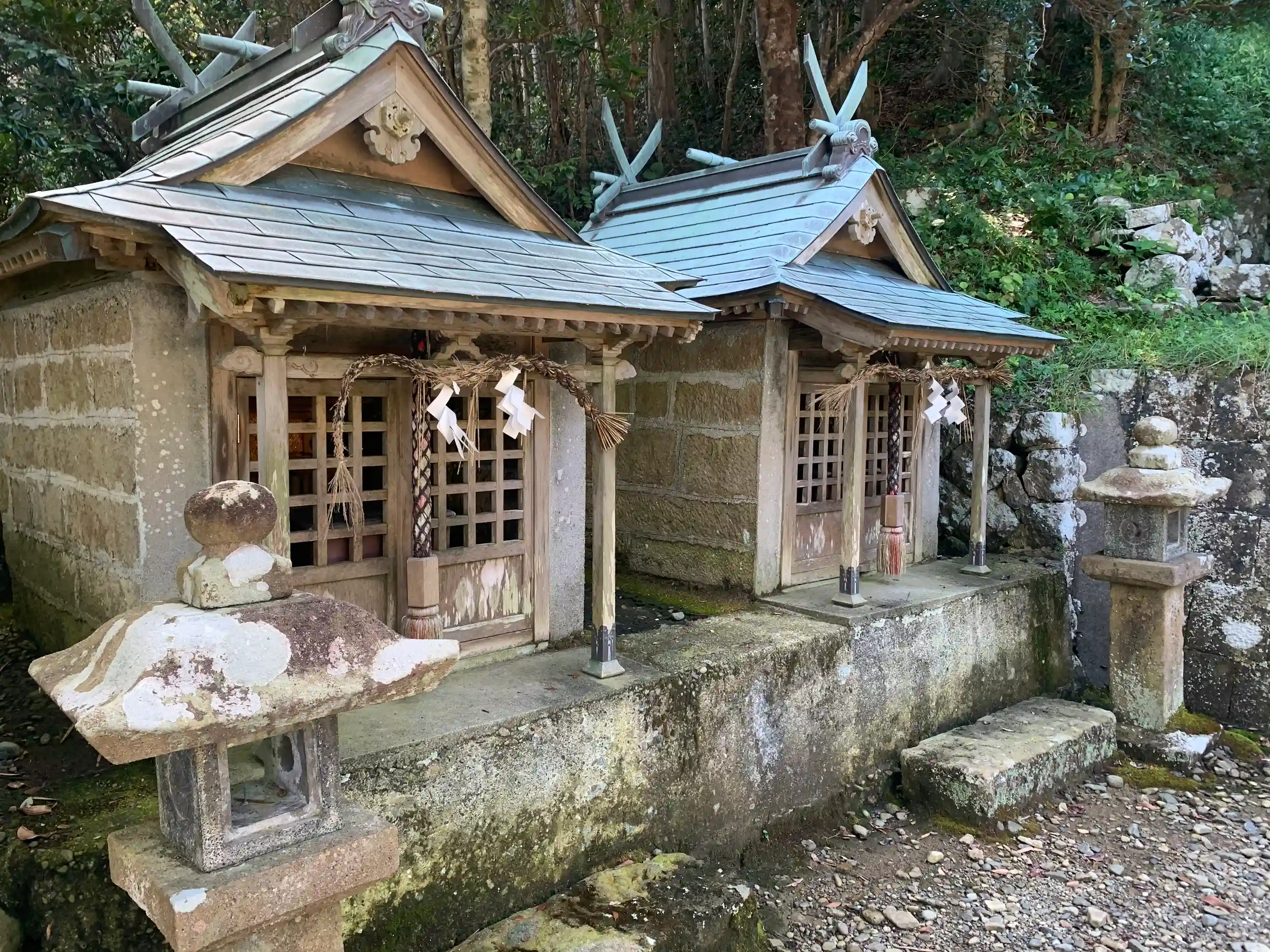 家と家の間の細い道を進み、草で覆われた道を進んで海が見えてくると神社。