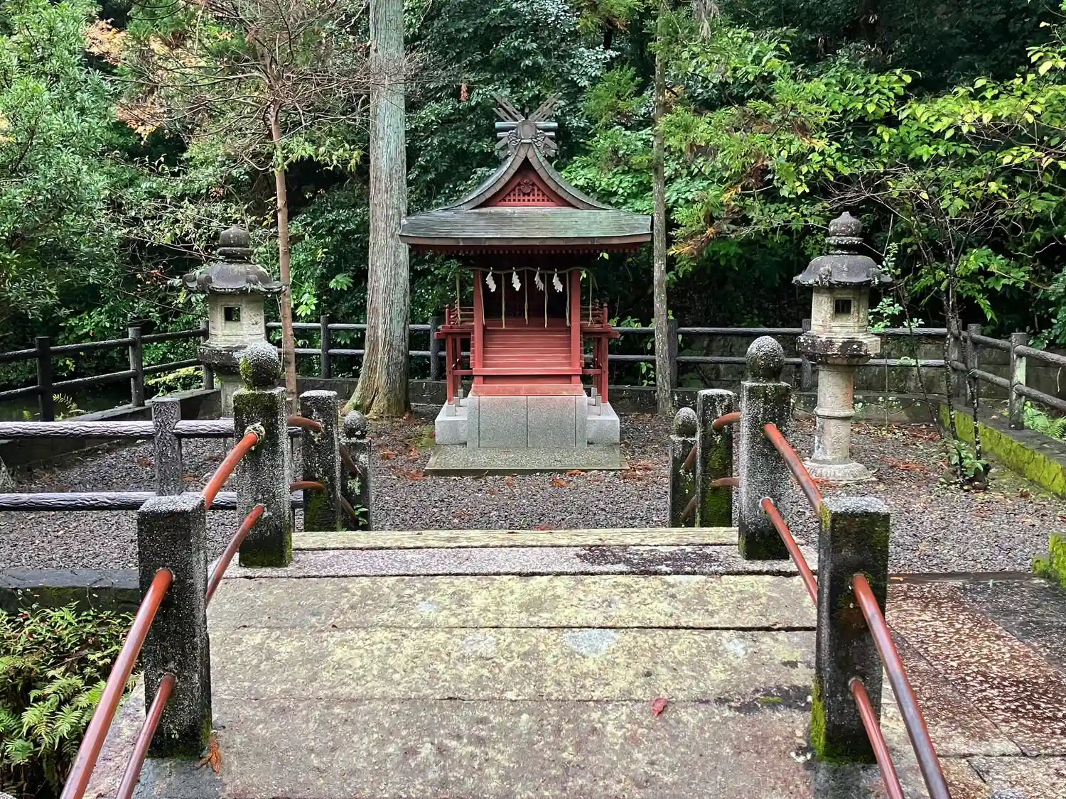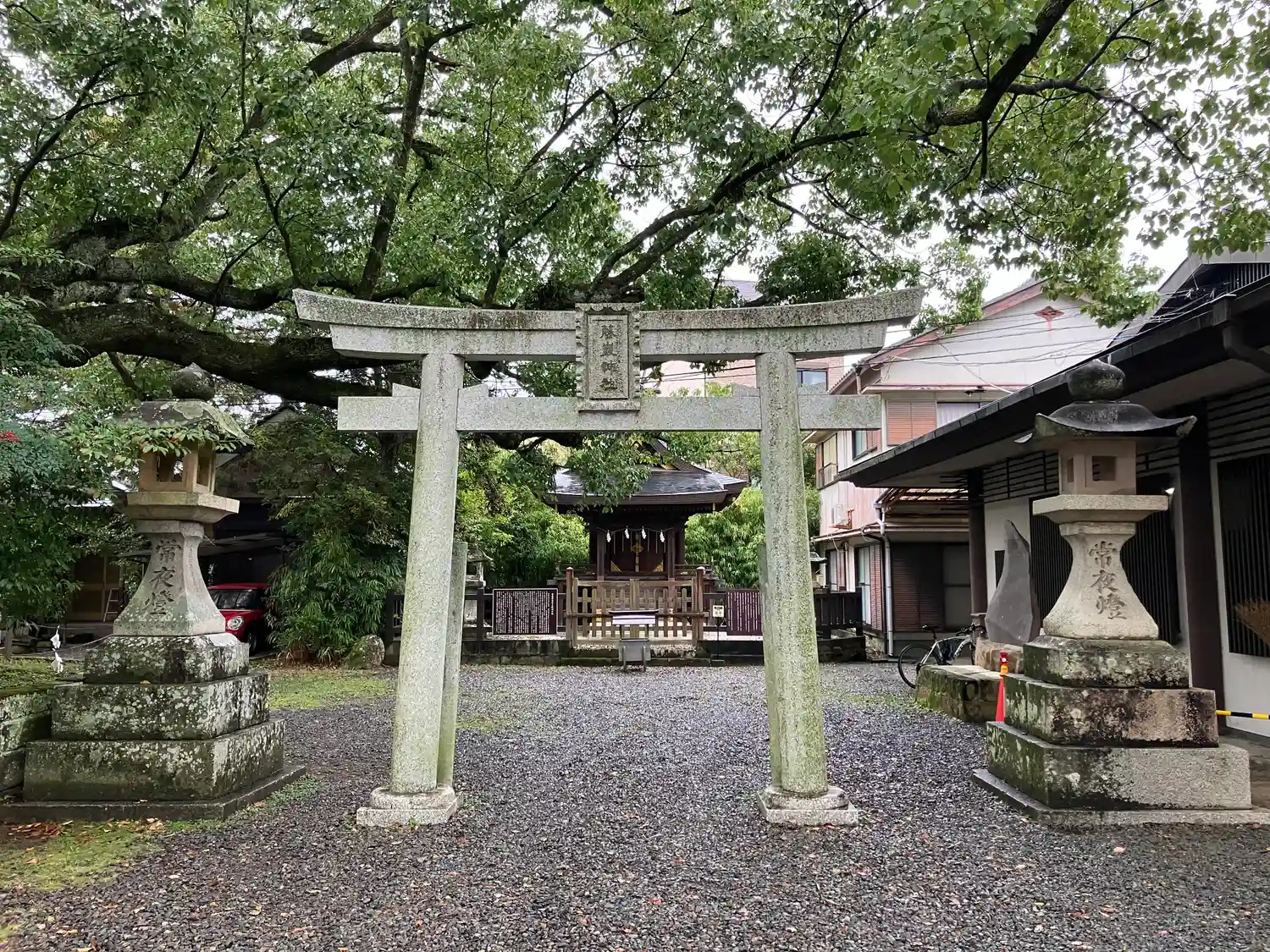 太陽の光を遮るように樹木が生い茂り薄暗い境内。