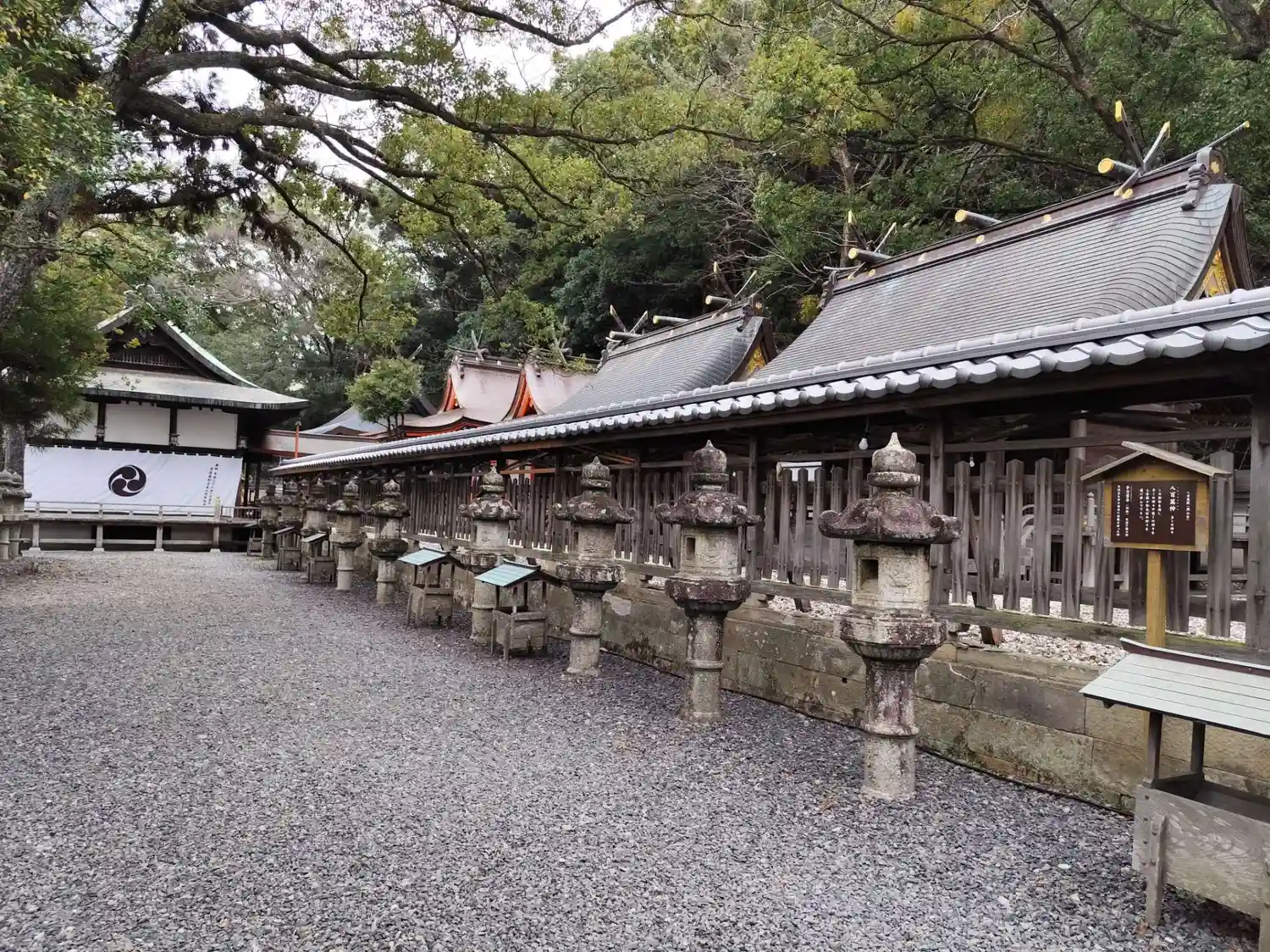 社殿が、西殿、本殿、上殿、中殿、下殿、八百萬殿の順に並んでいます
