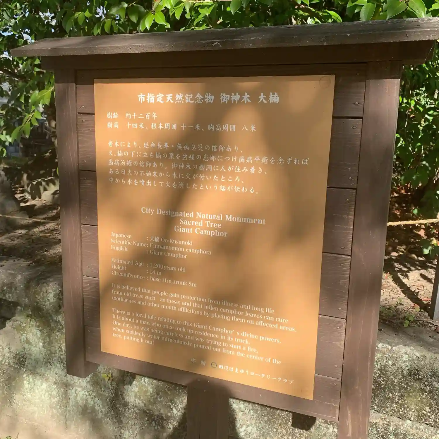 樹齢1,200年と伝わり、市天然記念物に指定されています。延命長寿・無病息災の信仰があり、また、楠の葉を歯痛の患部につけると平癒すると言われています