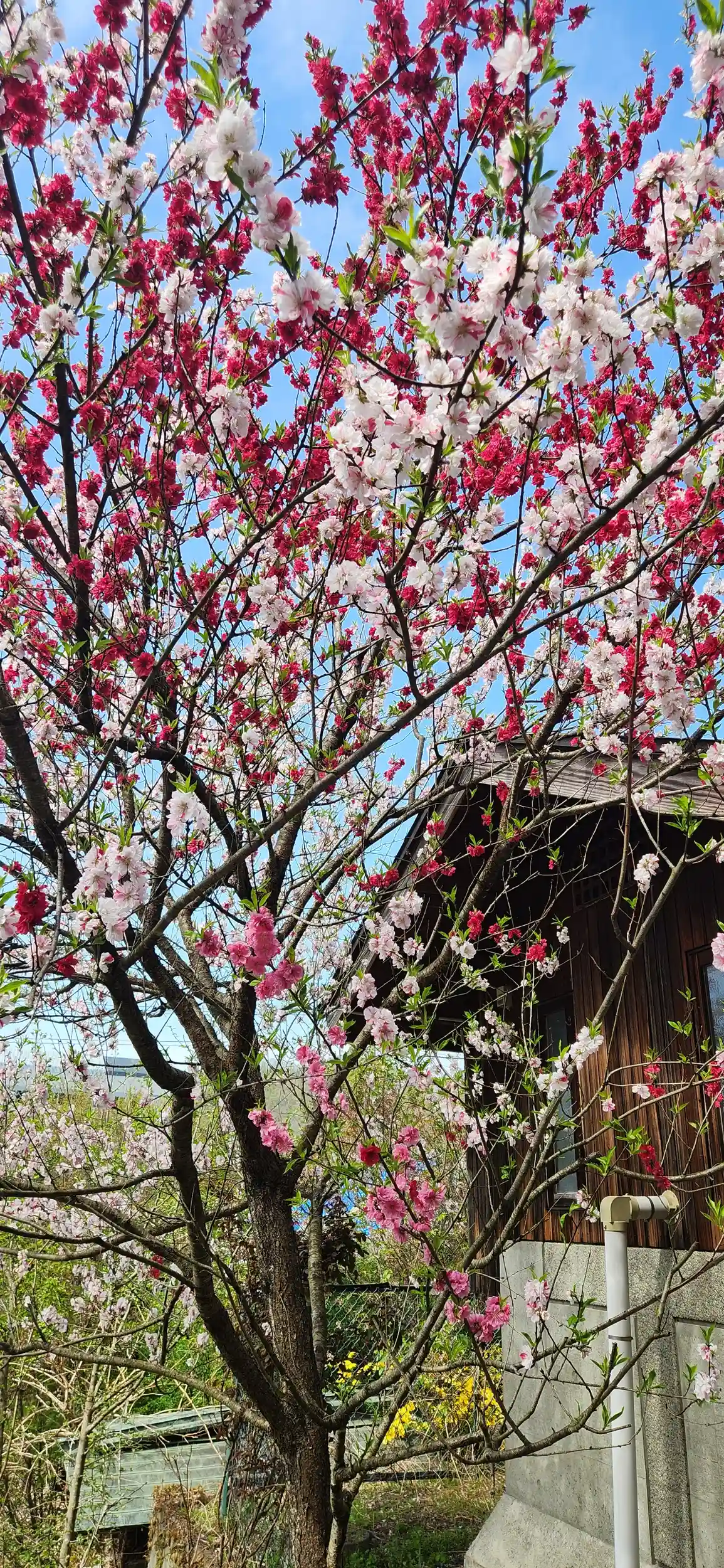 山門前にある、色とりどりの桜。そして鐘。