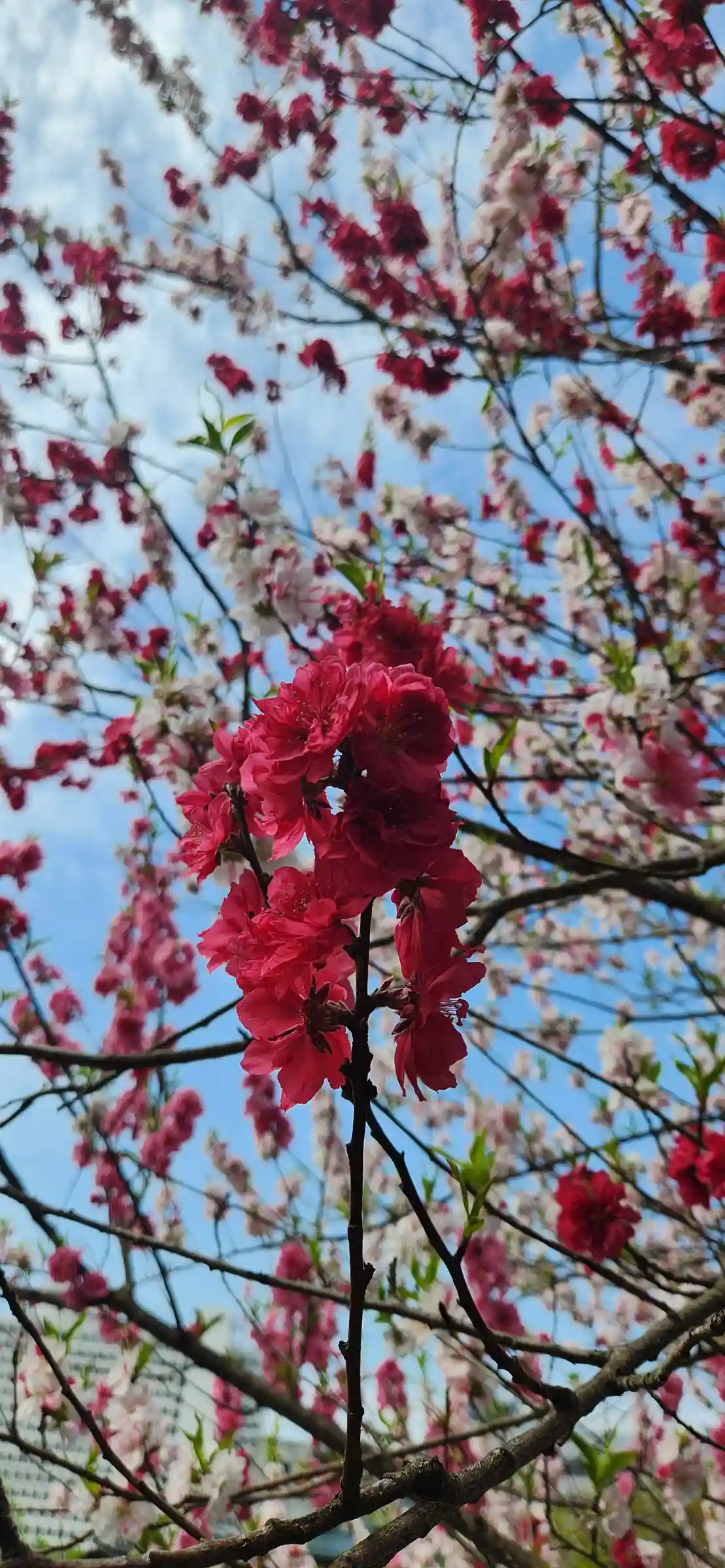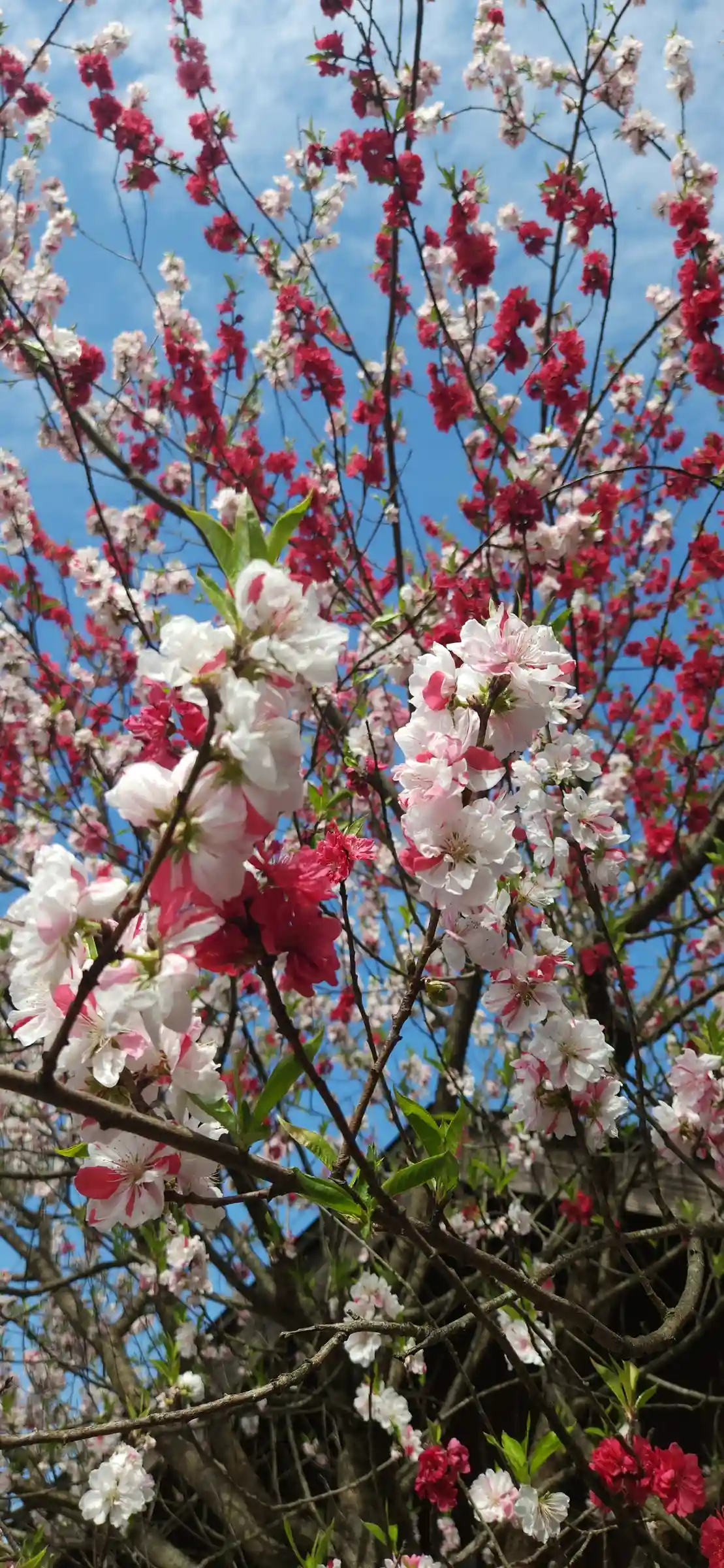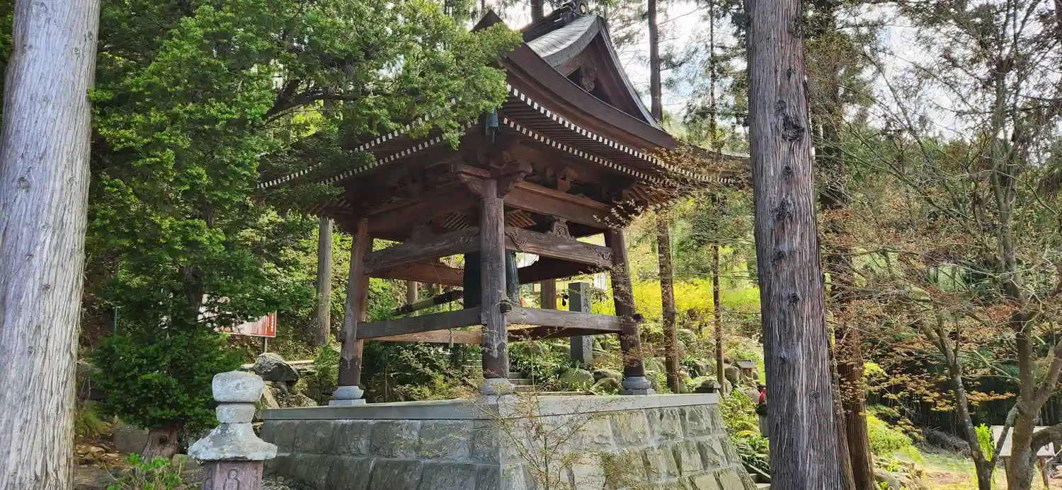 山門前にある、色とりどりの桜。そして鐘。