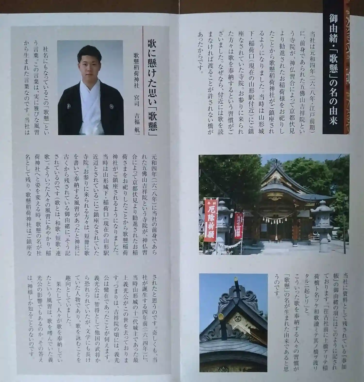 歌懸稻荷神社 しおり(主祭神、配祀神、御由緒(歌懸)の名の由来、歌に懸けた思い(歌懸)宮司様からの言葉)が書かれてます