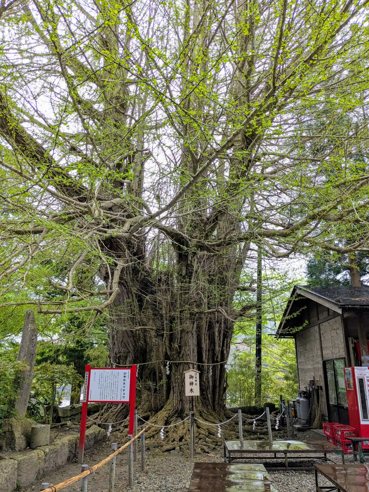 御主祭神 大山咋命。山寺の根本中堂の参道の石段の手前の鳥居からが神社の参道です、「煩悩の数108段」と書かれています。参拝の方はやはり立石寺がメインようで、拝殿前を通過する人が多かったような気がしました 。境内にある雄株の御神木の大イチョウは、慈覚大師御手植えで樹齢約1200年と伝えられています 幹周 9.6m 樹高 30m 暴風で、樹高約30mあった主幹が損傷し樹冠の大半を失いましたが、見る限りではとても元気そうです