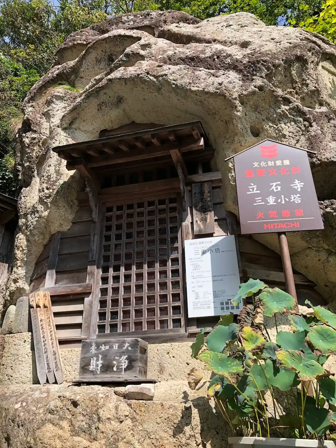 岩の中に建ててある!なるほど!三重「小」塔か!すごい造りです。一生懸命覗いたけど、この日は快晴で外が明るいので細部までよく見えず。