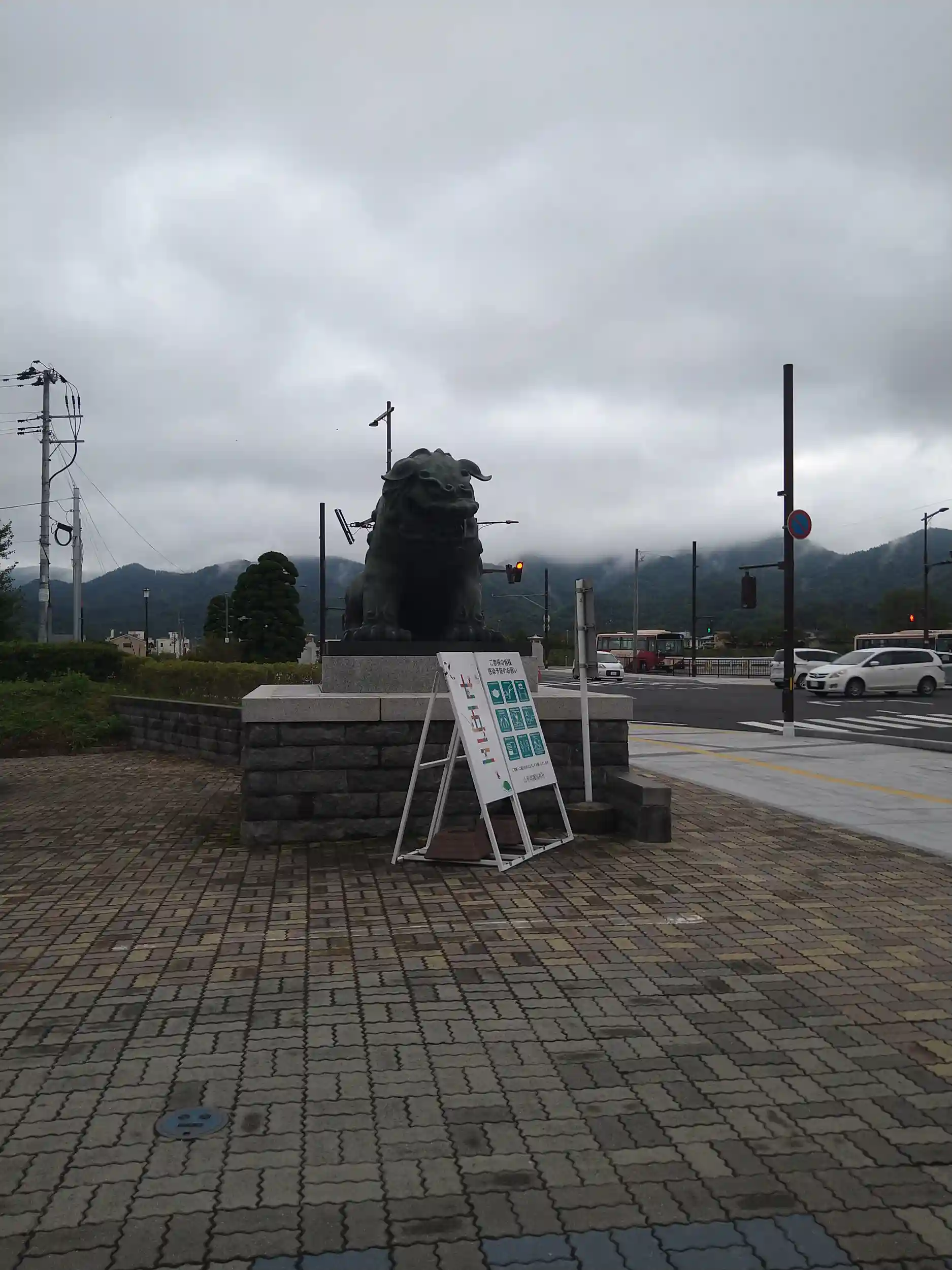 御朱印を頂き、入り口の鳥居をくぐると、道路に面した処に立派な狛犬【狛獅子?】。