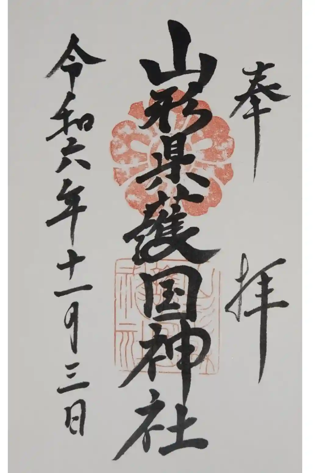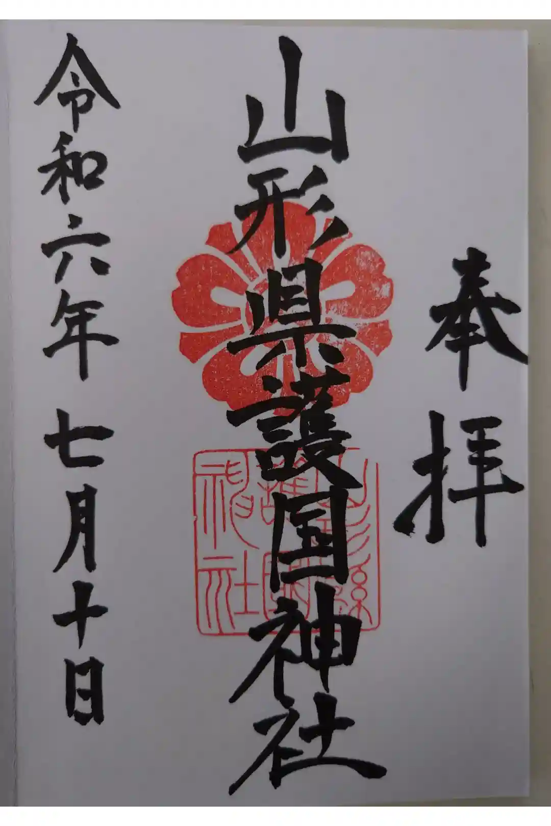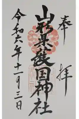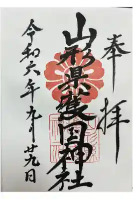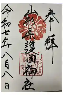 真ん中に山形縣護國神社と書かれ、社紋と社印が押された御朱印です。