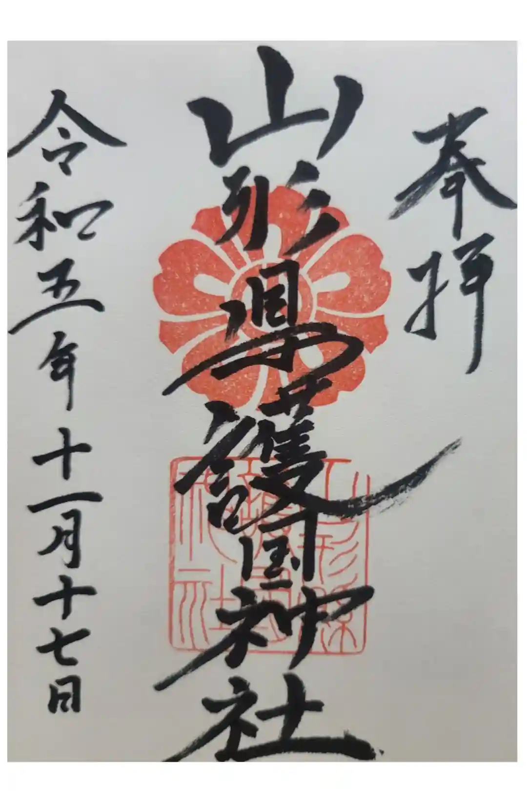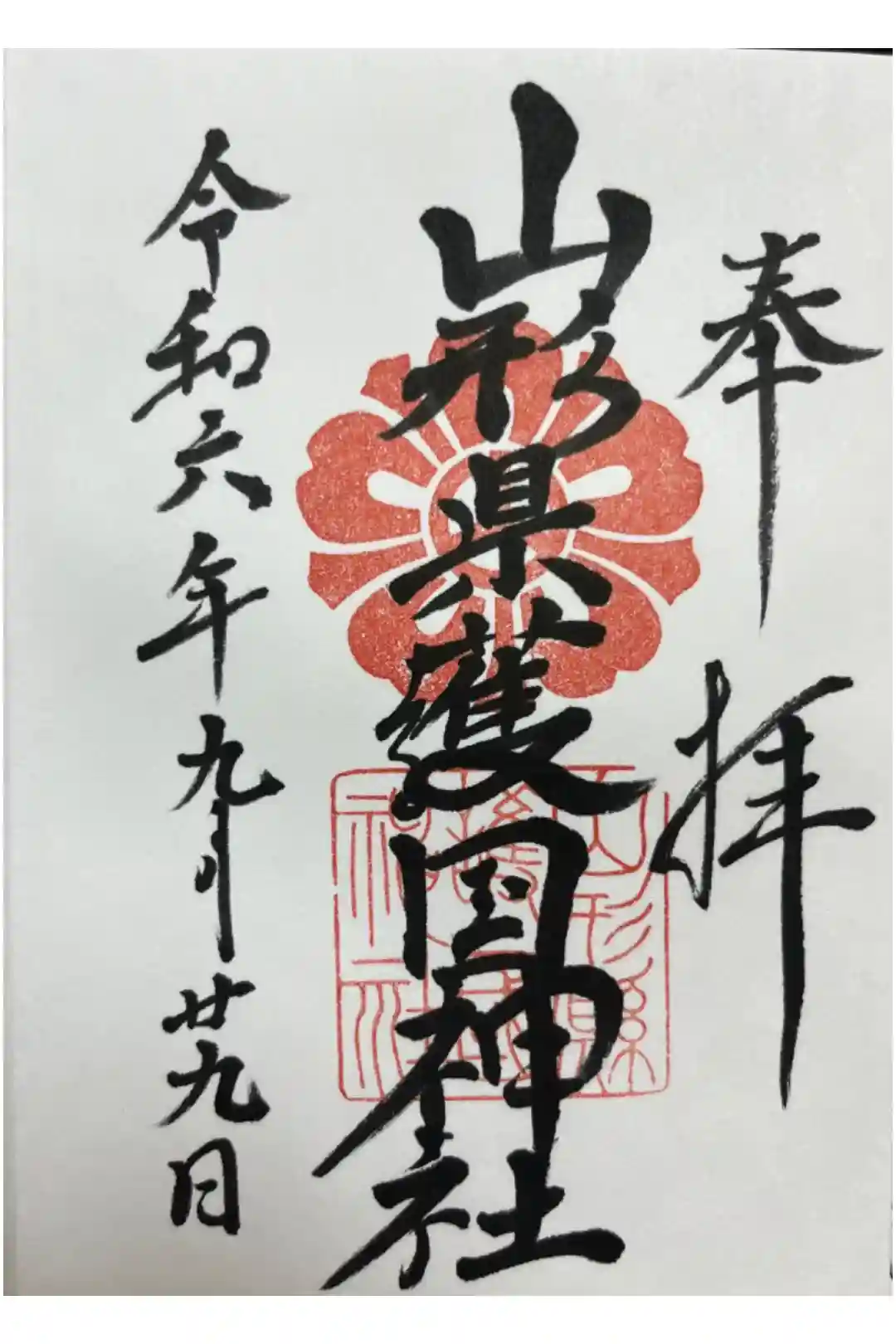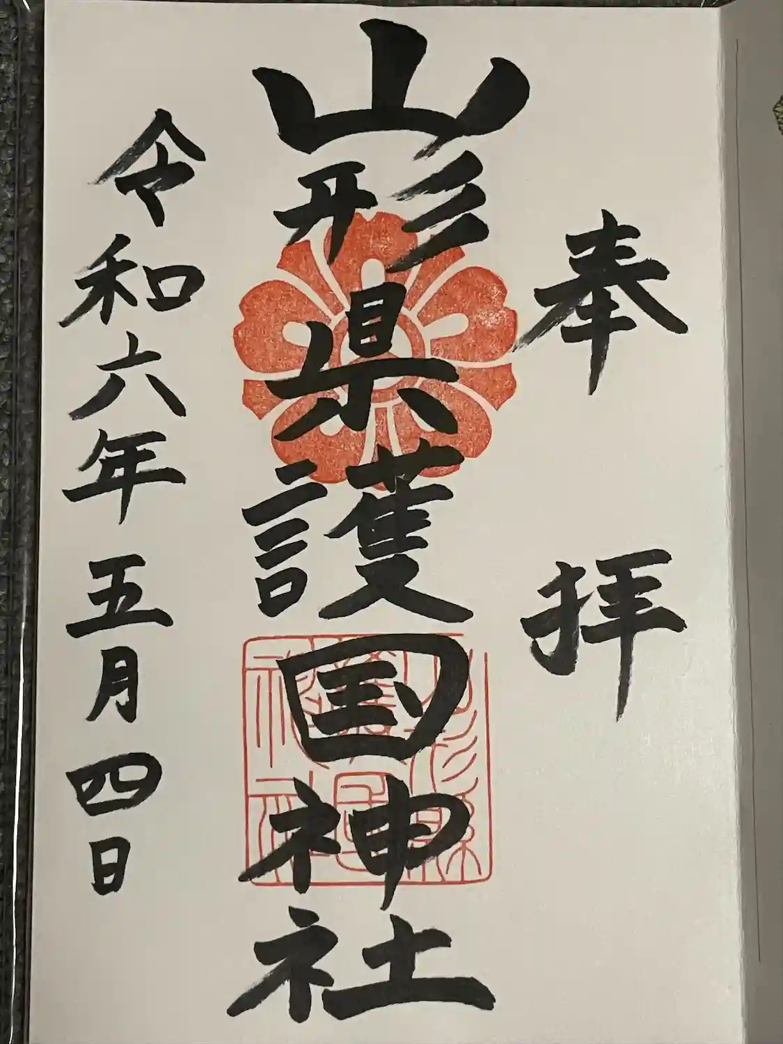 真ん中に山形縣護國神社と書かれ、社紋と社印が押された御朱印です。