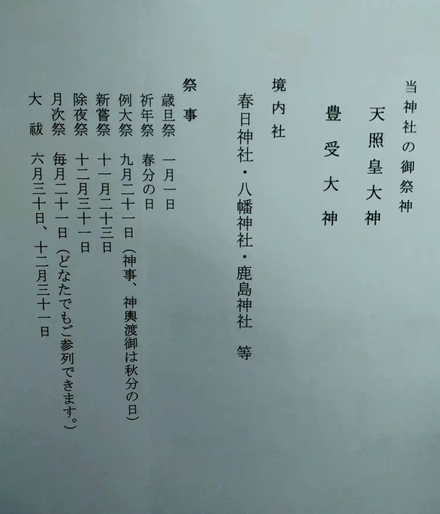 印鑰神明宮 しおり(当神社の御祭神、境内社、祭事)が書かれてます