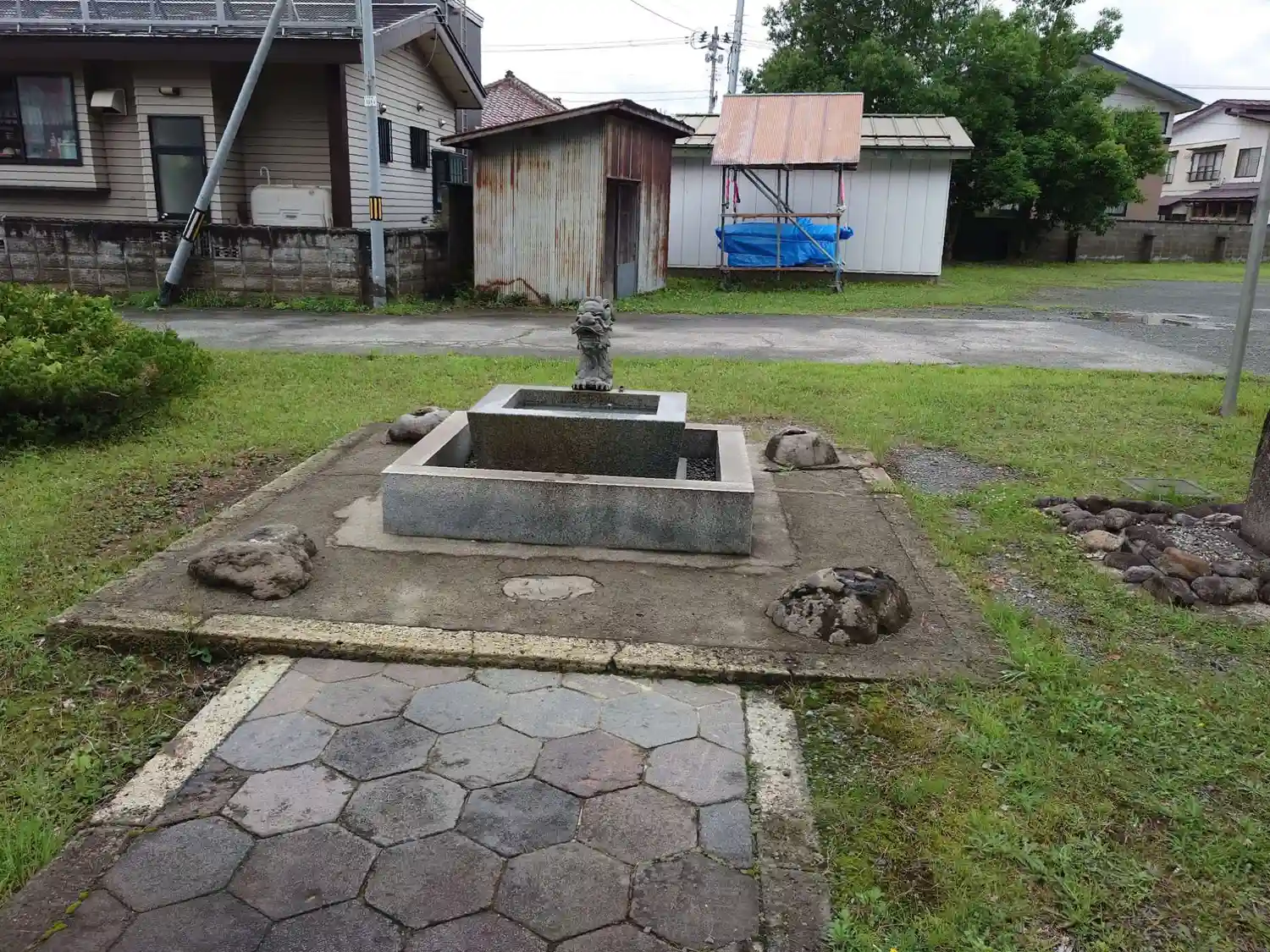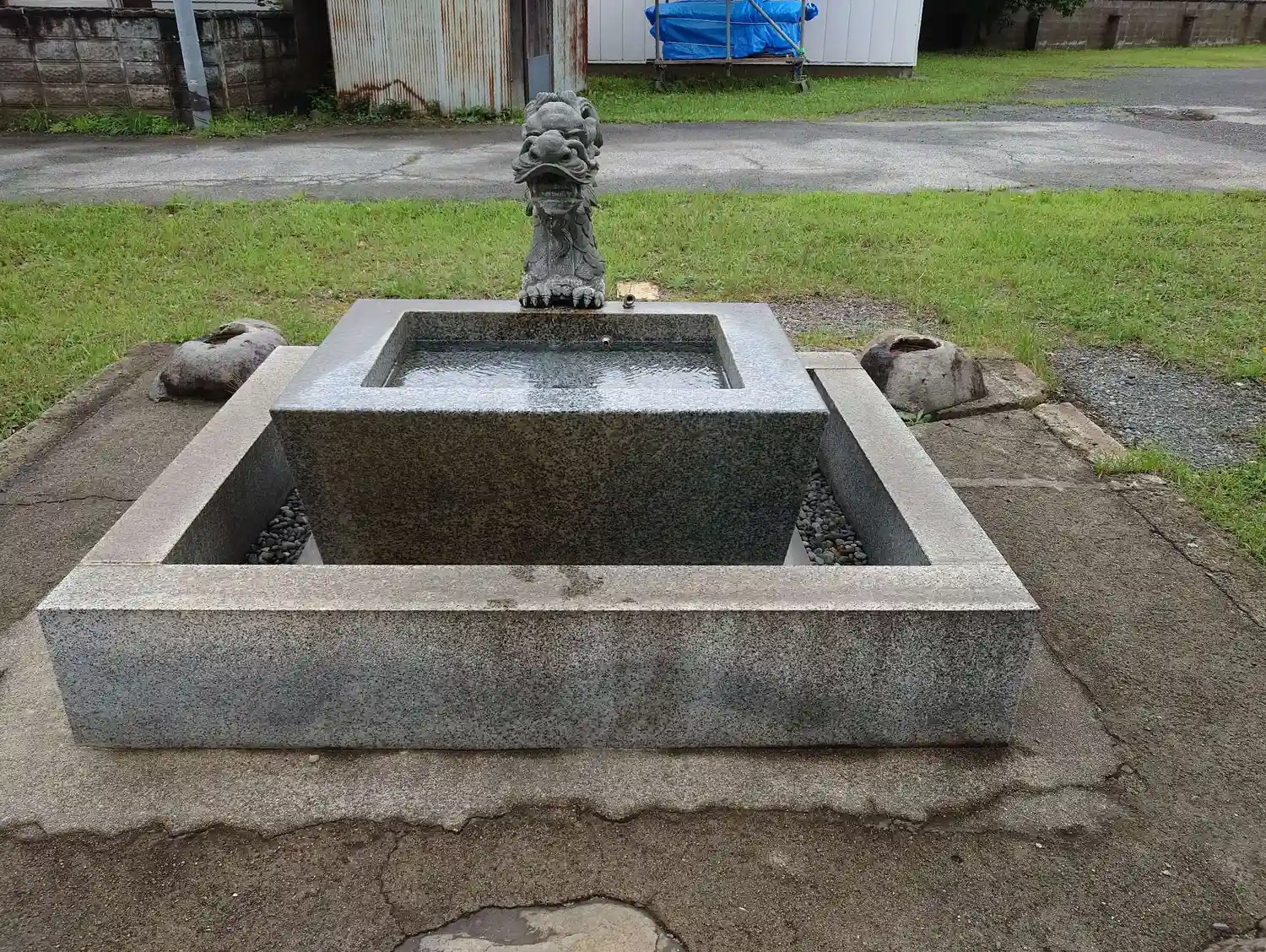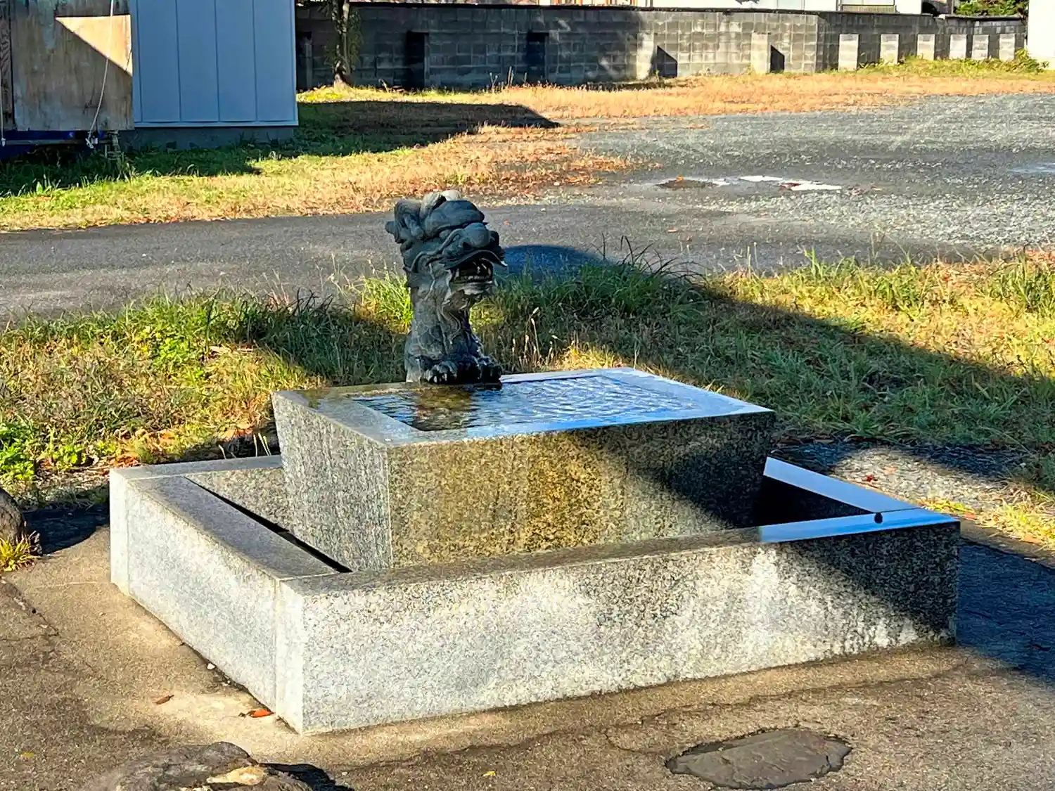 参道左側の<手水盤>。屋根なしのシンプルな造り。