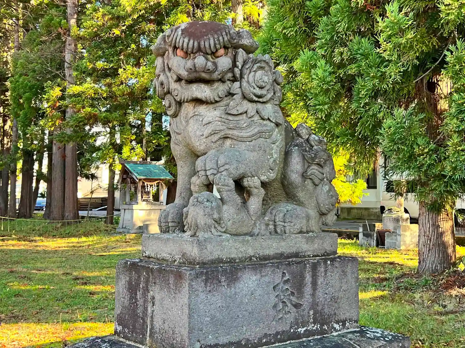 二の鳥居の右側の<狛犬>。こっちは見た目もっと怖め。(^_^;)