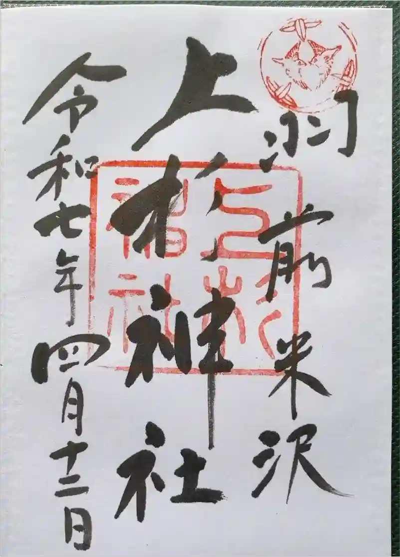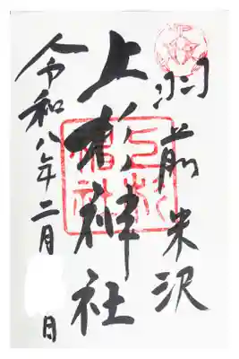 中央に上杉神社、右側に羽前米沢(うぜんよねざわ)と書かれた御朱印です。
