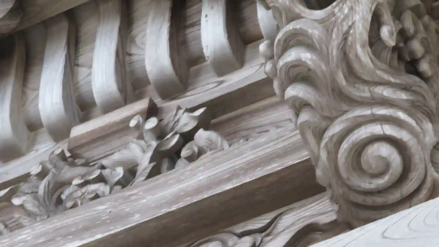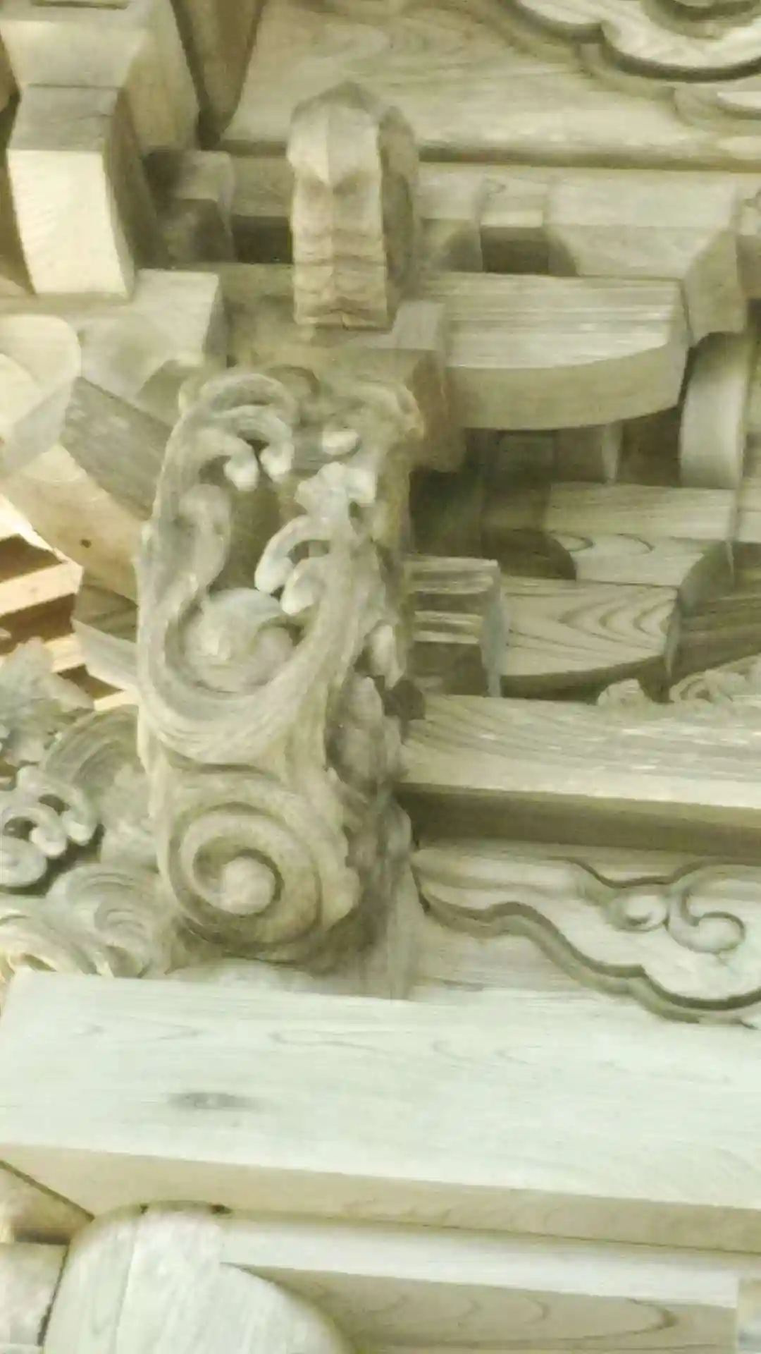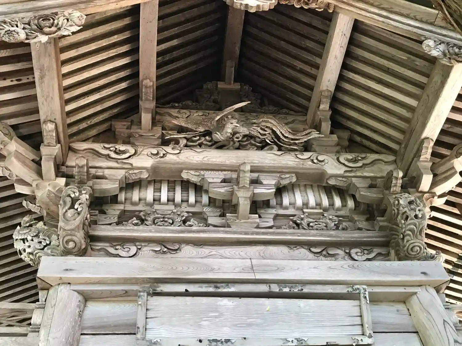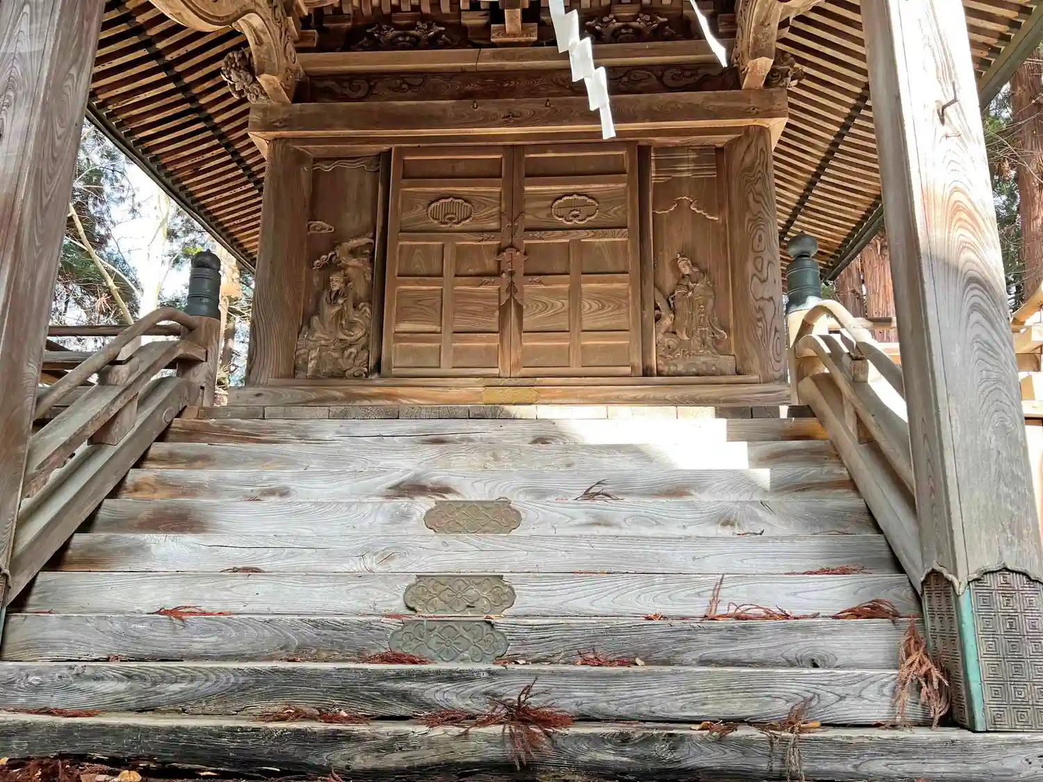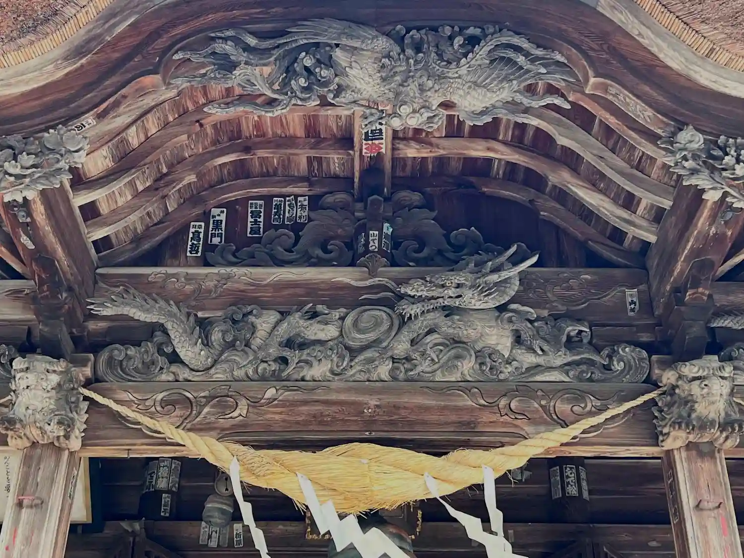 唐破風下の彫刻。出羽地方独特の形をした注連縄。