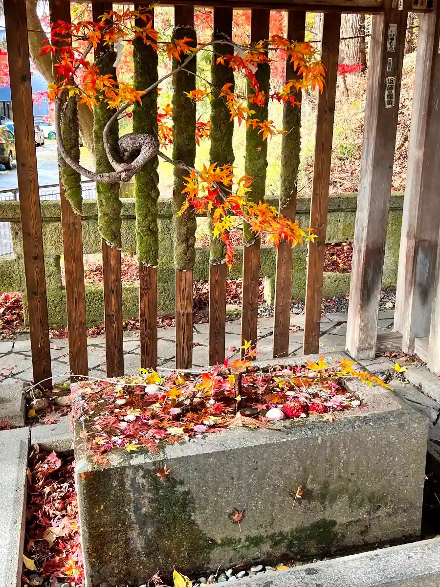 手水舎の背後にはモミジの飾りつけが。手水盤はモミジの葉でいっぱい。