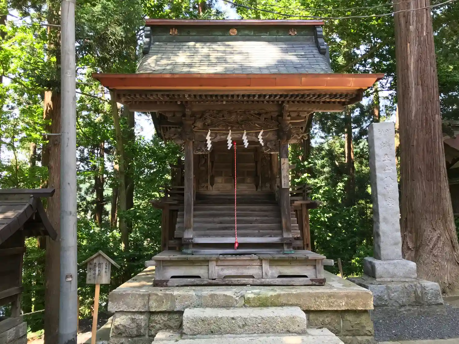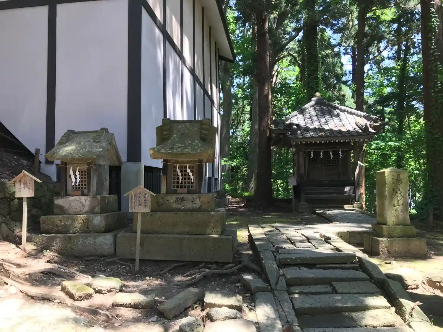 さらに登って、階段途中左側にある境内社群。左から順に<月山神社>、<湯殿山神社>、右奥は<大社神社>。