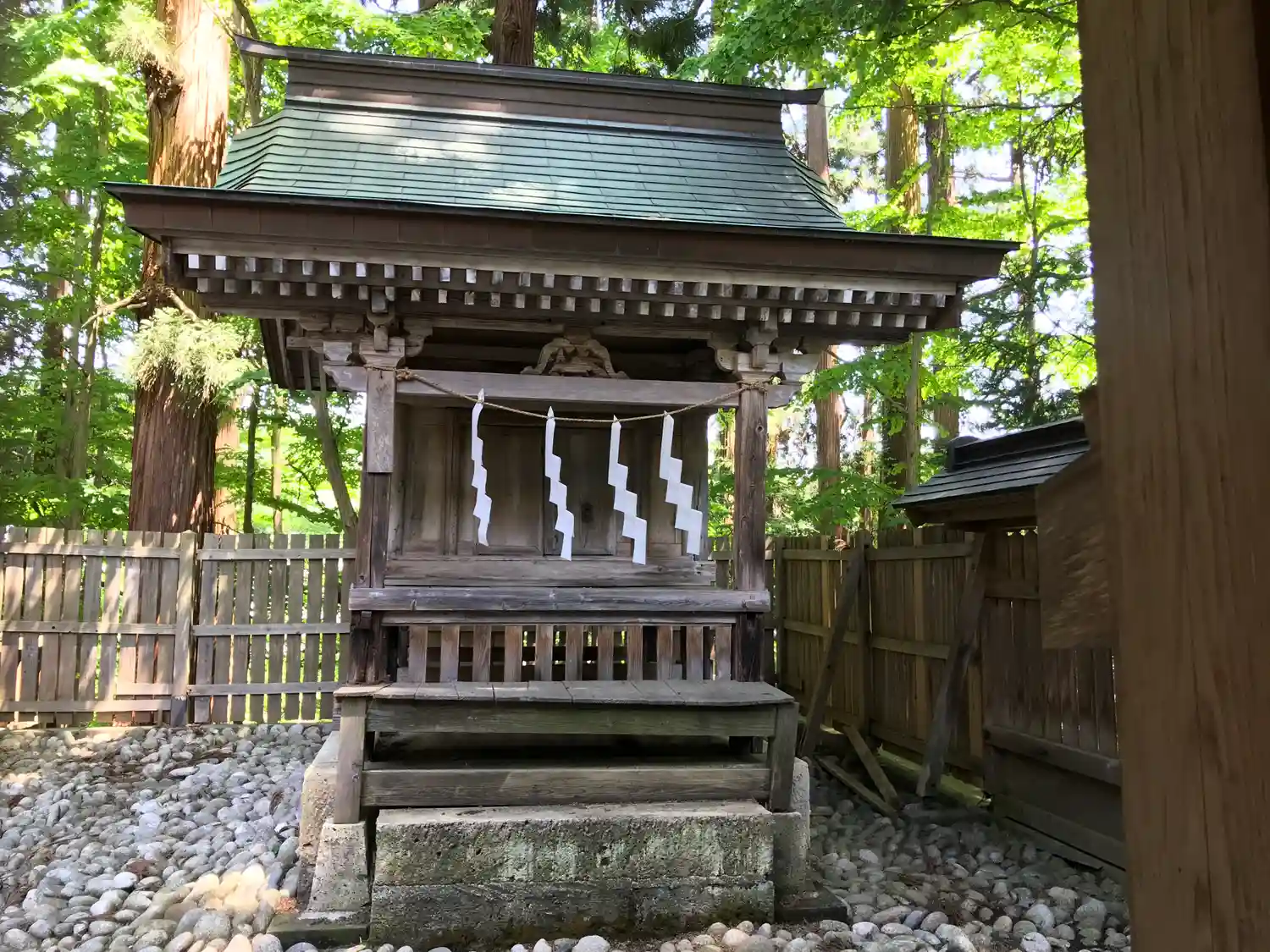 拝殿左側の境内社。左から順に<愛宕神社>、<保呂羽(ほろは)神社>、<羽黒神社>、ひと回り大きいのは<菅原神社(文殊堂)>。