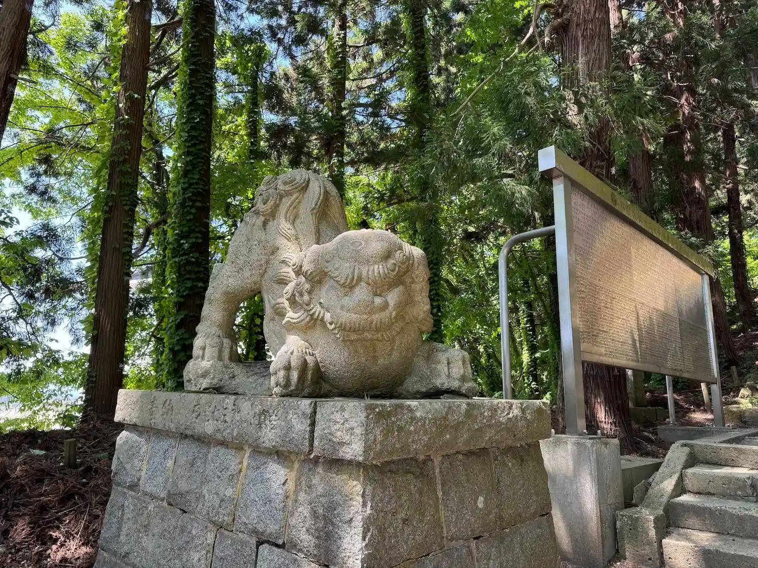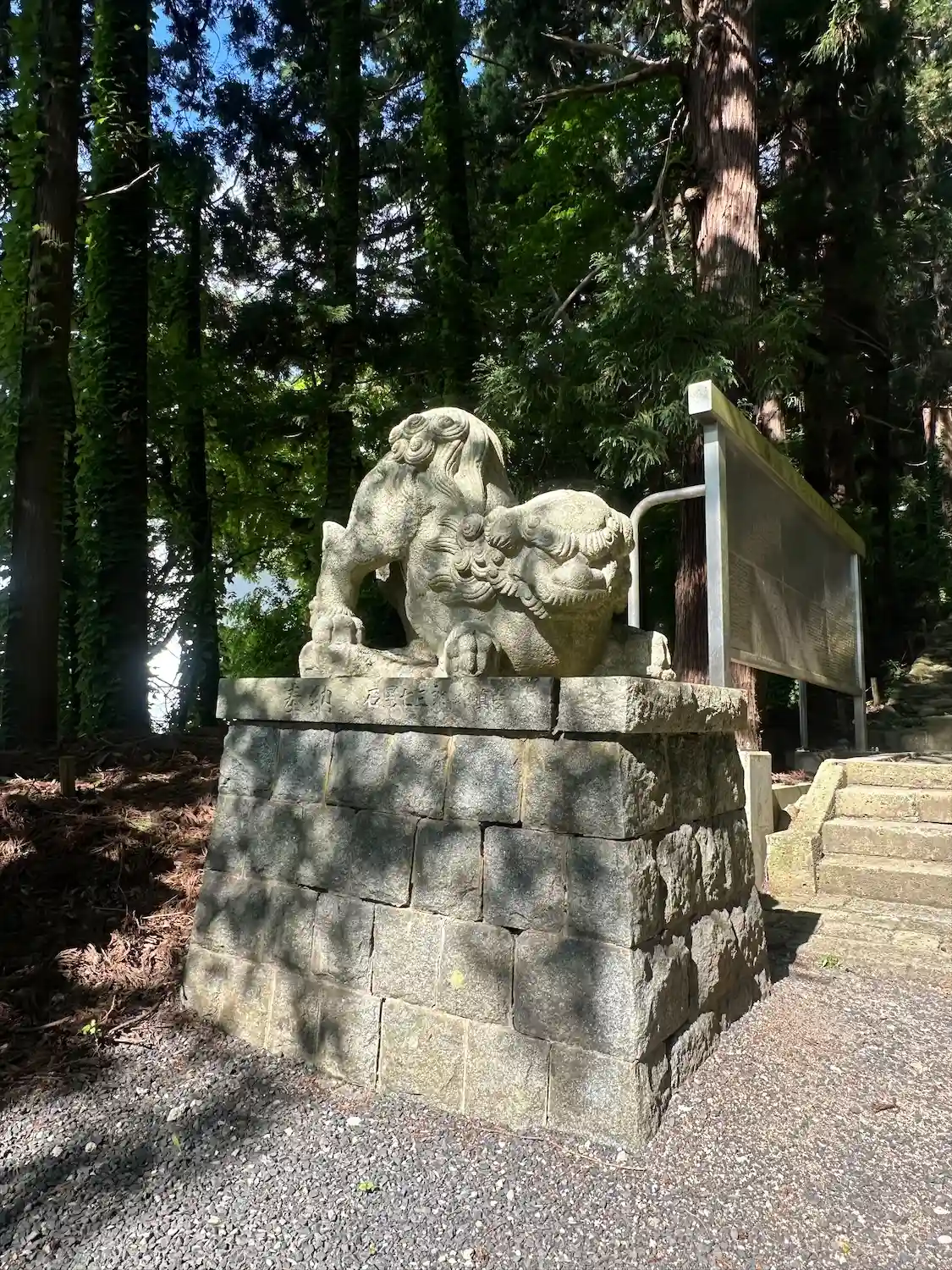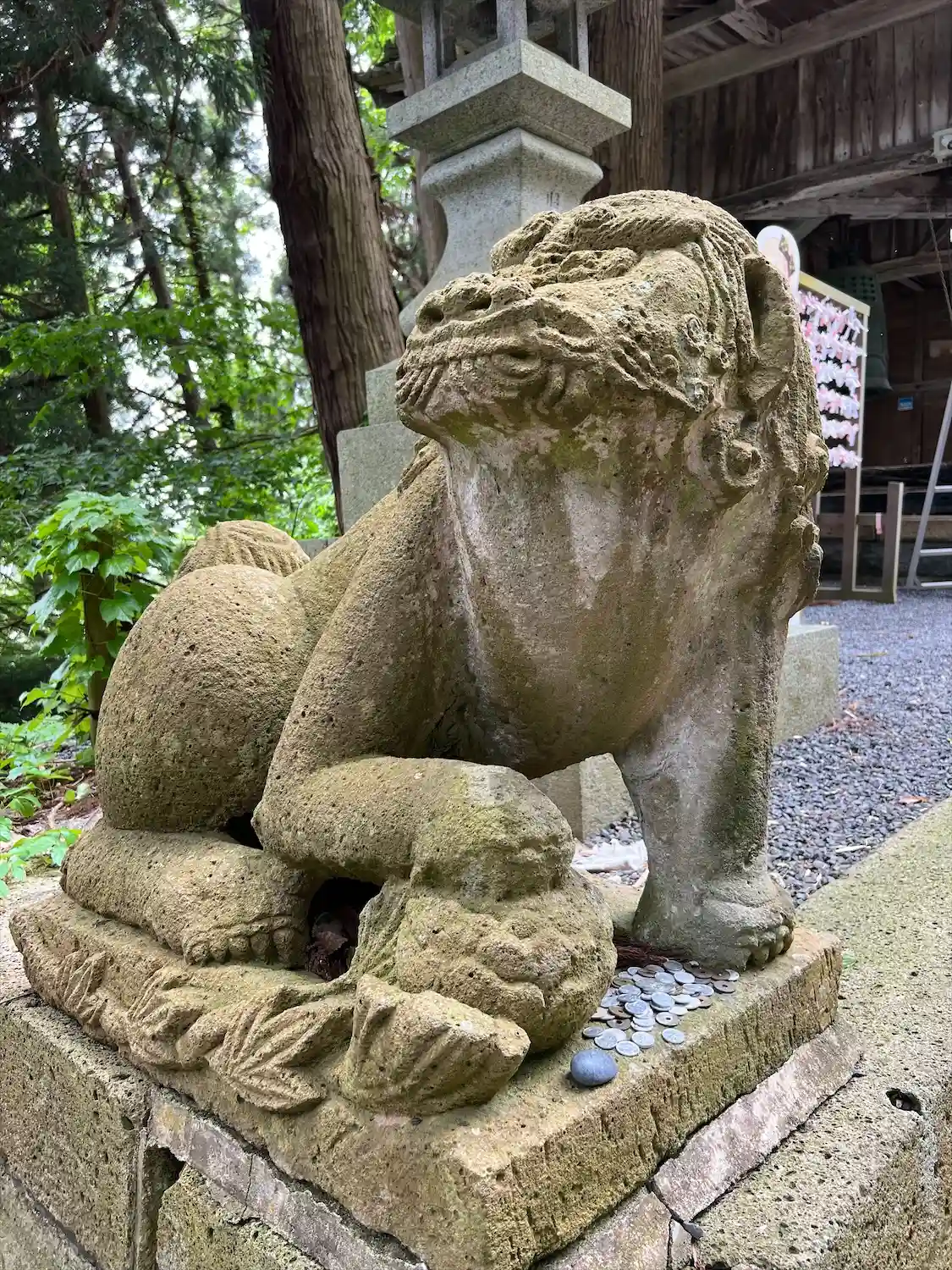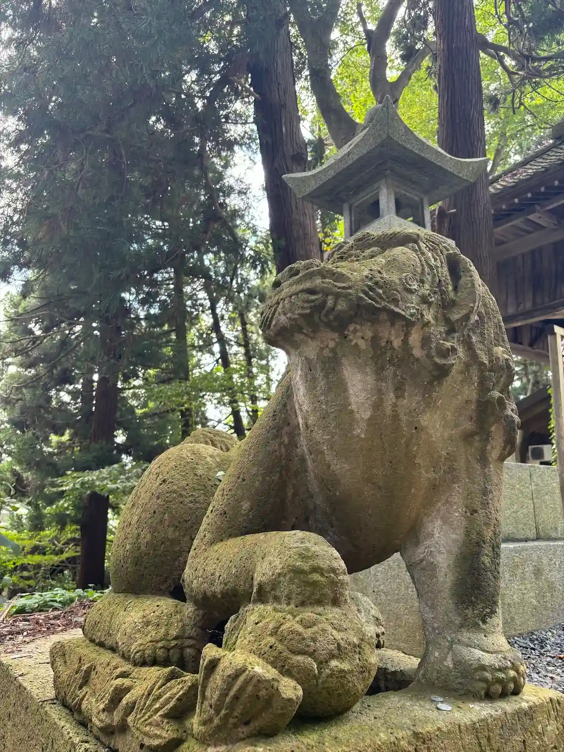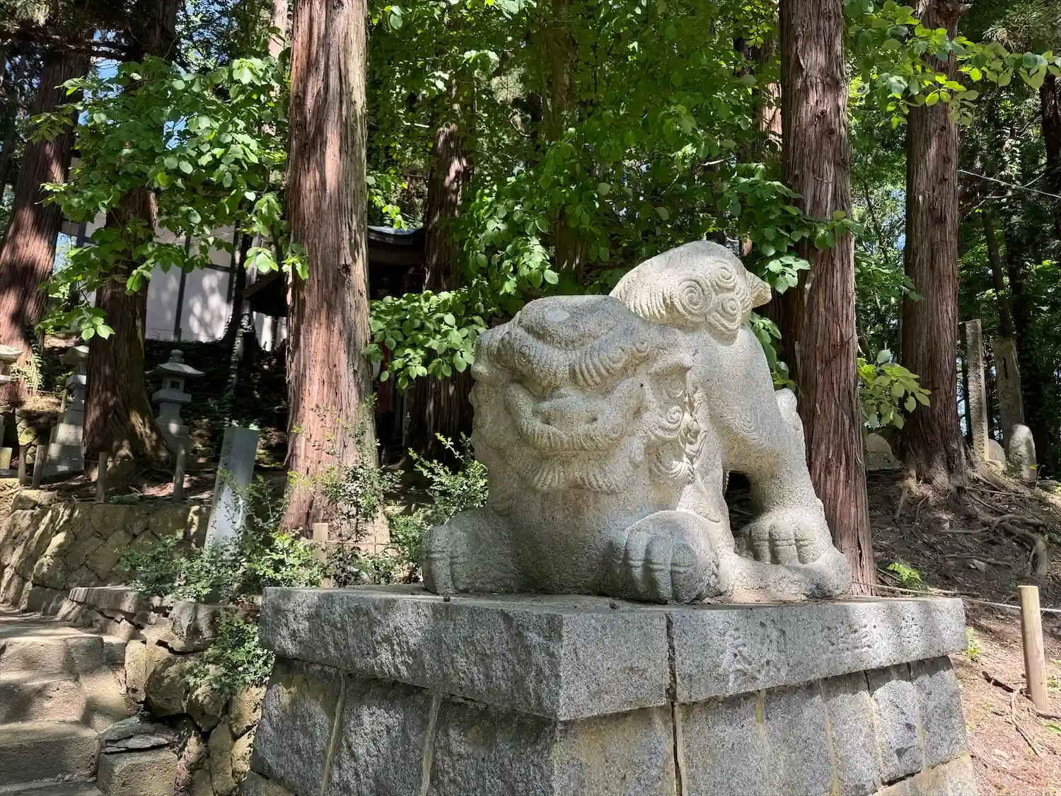 右の狛犬の後方、少し離れたところに見える<拝殿>。