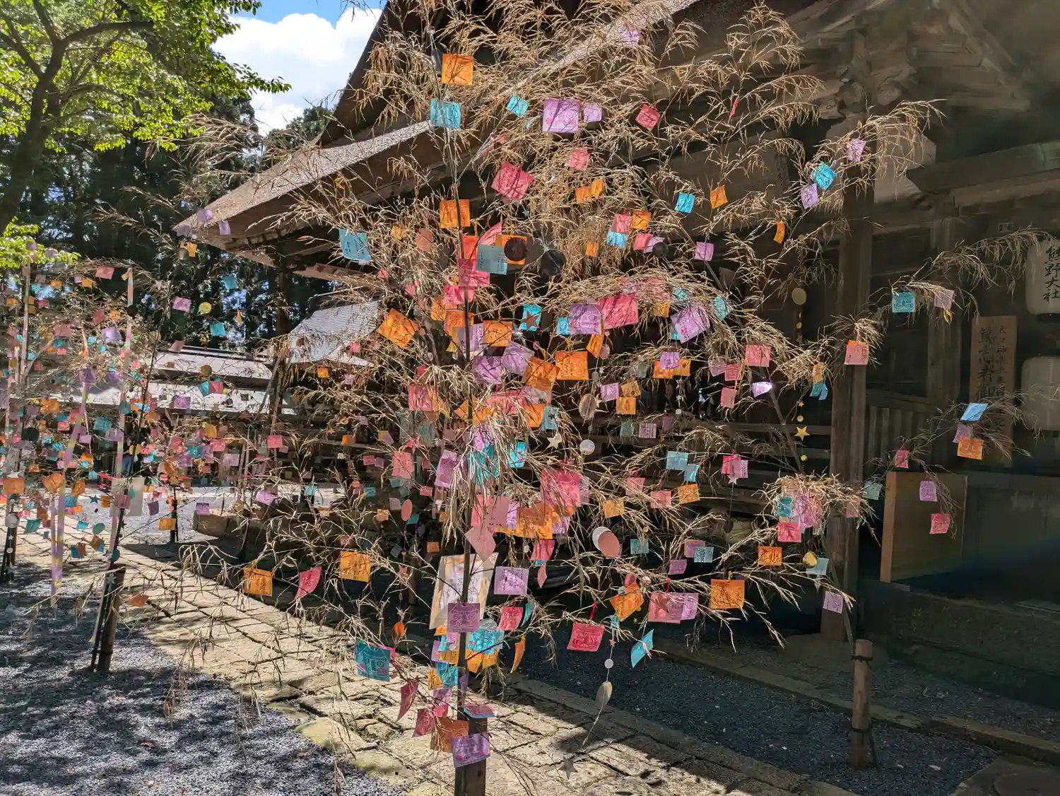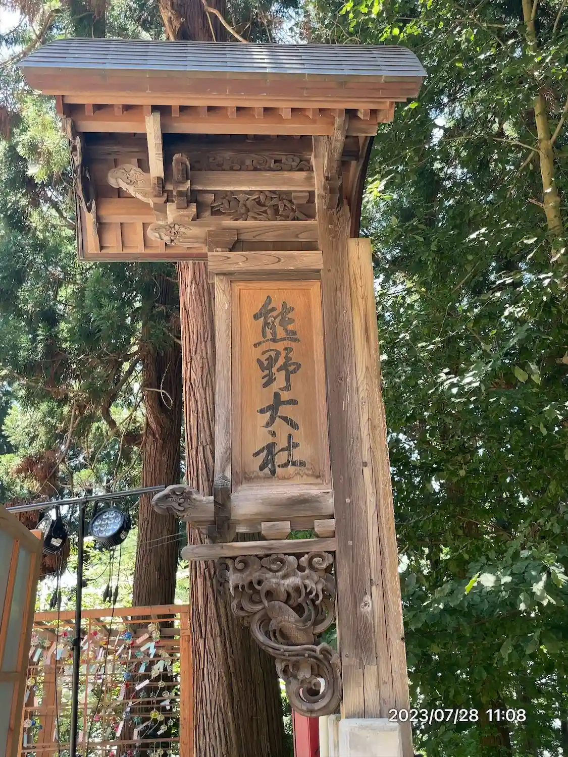 熊野大社二度目参拝です。社殿の茅葺きの屋根が修繕中でした。境内には風鈴の涼…