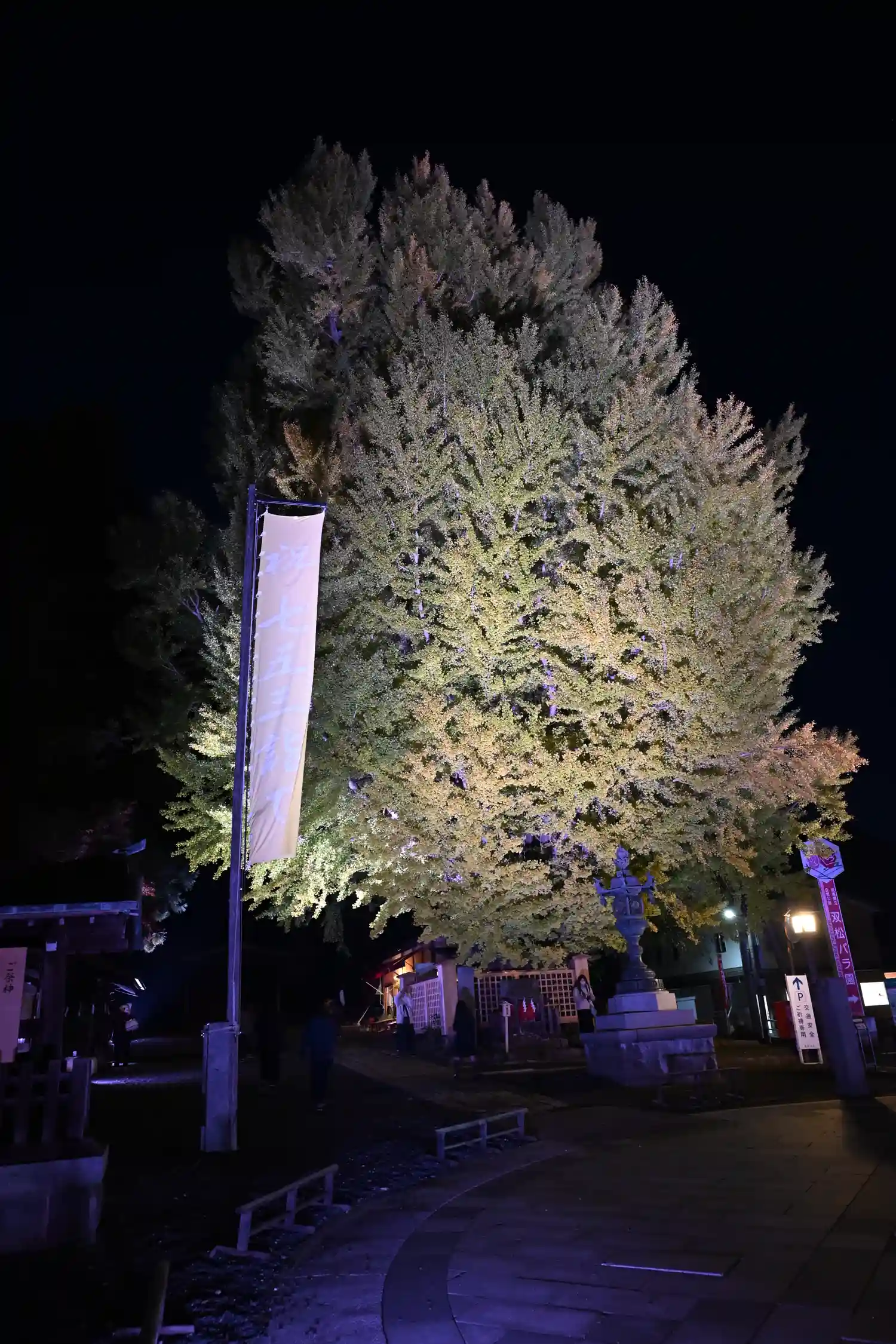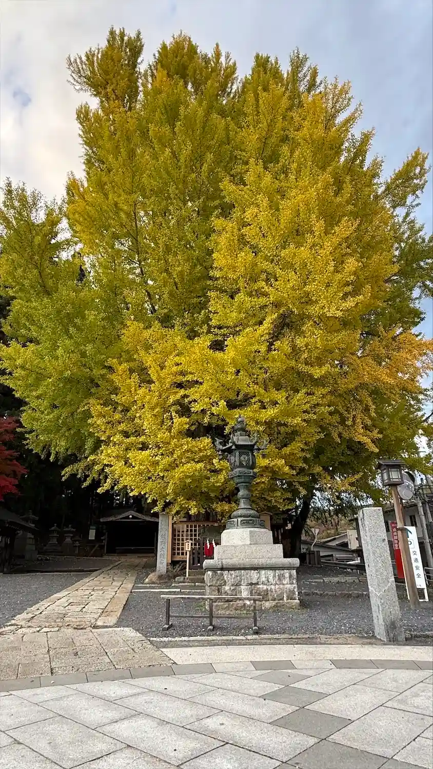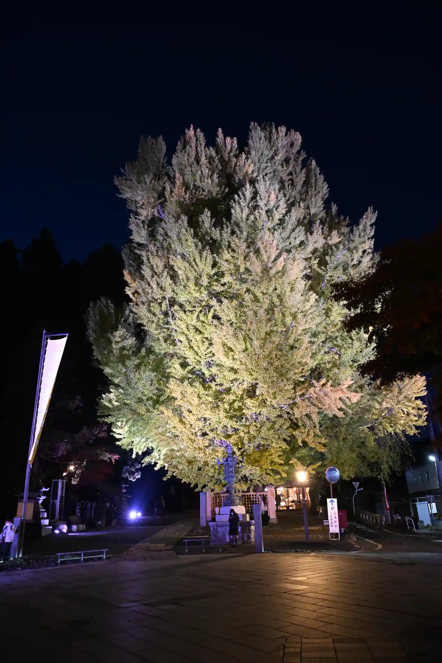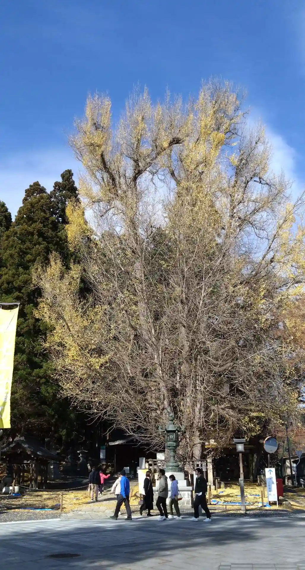 境内南東端入口にある<大銀杏>。推定樹齢は900年。かなり立派で巨大。下を歩く人の背丈と比べると、その大きさがよく分かる。毎年11月だけ、ライトアップがあるみたい。